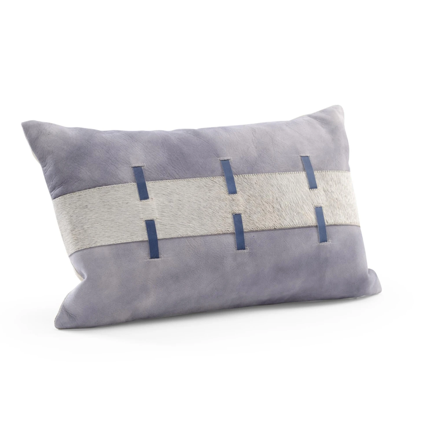 GREY SUEDE WITH GREY HAIR ON HIDE STRIP LACED WITH BLUE SUEDE NATURAL LINEN BACKING WITH SIDE ZIPPER AND DOWN AND FEATHER PILLOW INSERT
