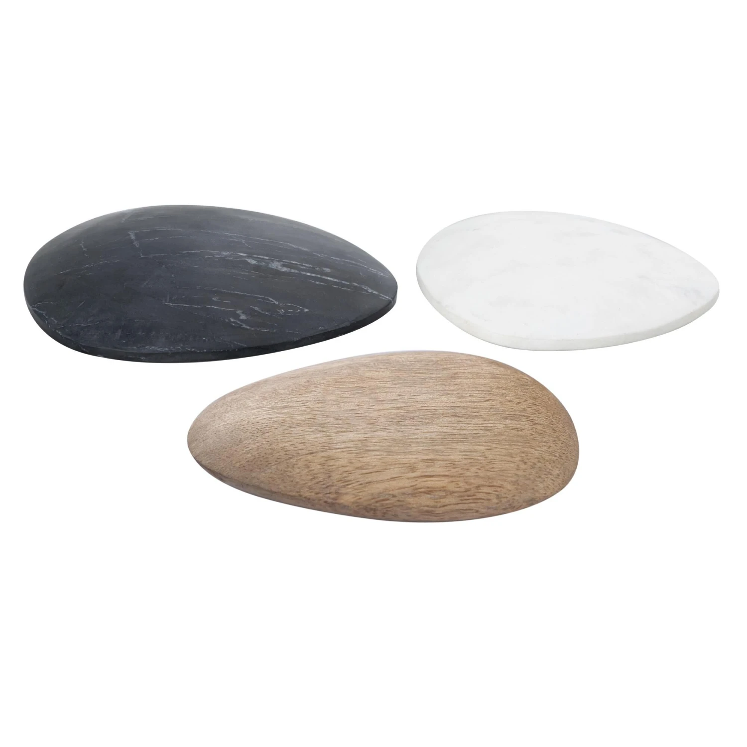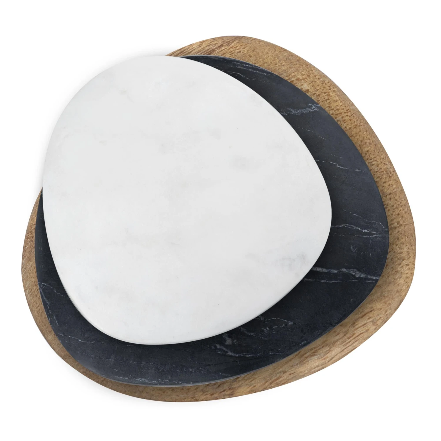 The Cairn Decorative Objects, sold as a set of three, are small rounded discs made from natural marble and wood. These sculptural pieces can be scattered as objects on a table setting, decorative tray, or used as paper weights.