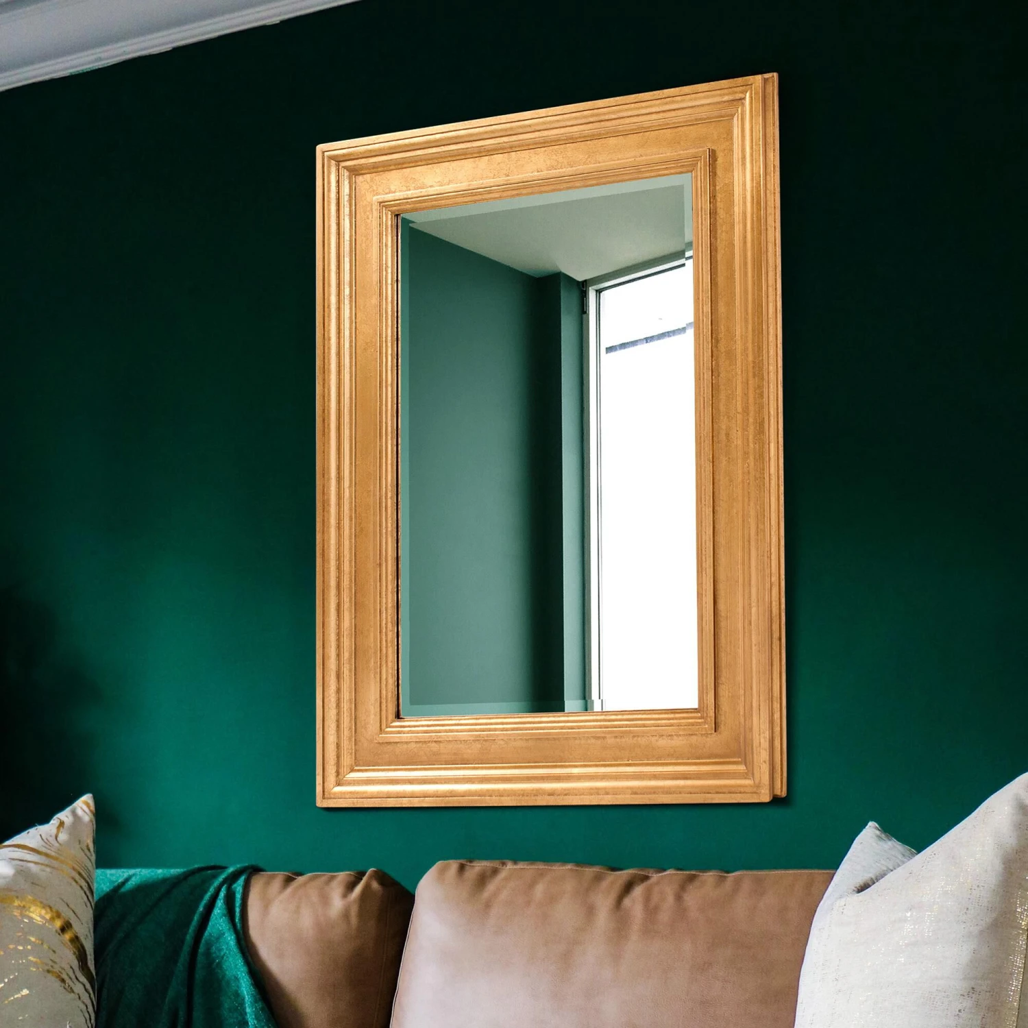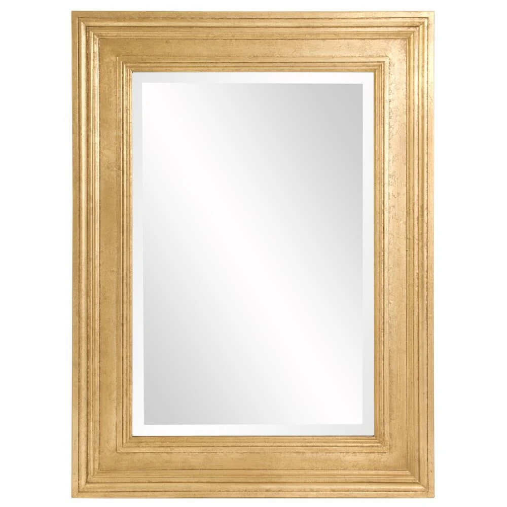 The stately frame is made from wood and is accented with grooves for added depth and character. It is then finished in a lovely gold leaf. For added detail the mirror features a one inch bevel. Make any room instantly brighter or appear larger by adding this mirror to the mix. This simple yet stunning piece would be a great addition to any room. D-rings are affixed to the back of the mirror so it is ready to hang right out of the box in either a horizontal or vertical orientation!