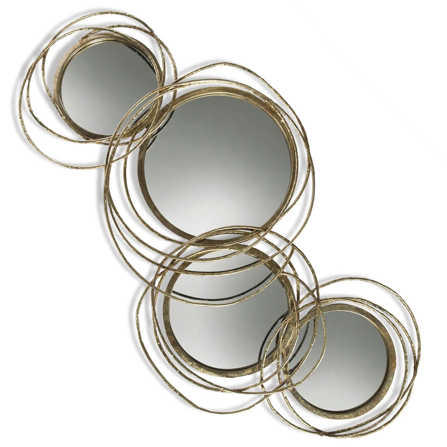 A tasteful contemporary touch, the Conway mirror uses intricate abstract shapes in a gold metal finish to create a transitional favorite. Made with a set of four individual round glass mirrors, this piece is a wall mounted delight ideal for hallways, living rooms, and bedrooms. With its elegant use of forms and engaging presentation, this mirror is a designer’s masterstroke.Features -Due to the production process, each piece is unique and no two are exactly alikeMirror has 4 circular plain glass beveled finished mirrors that are adjoined together by circular shaped metal frames that have a gold finish.Outer decorative metal frame circular rods have a hammered textured gold finish, & are abstractly placed around each circular mirror.Mirror can be hung vertically or horizontally on wall.Should be placed in a non-humid area of home to prevent metal frame from becoming rusted or tarnished. Not recommended for outdoor use!!Specifications -Install Orientation: Vertical/HorizontalLocation Rat