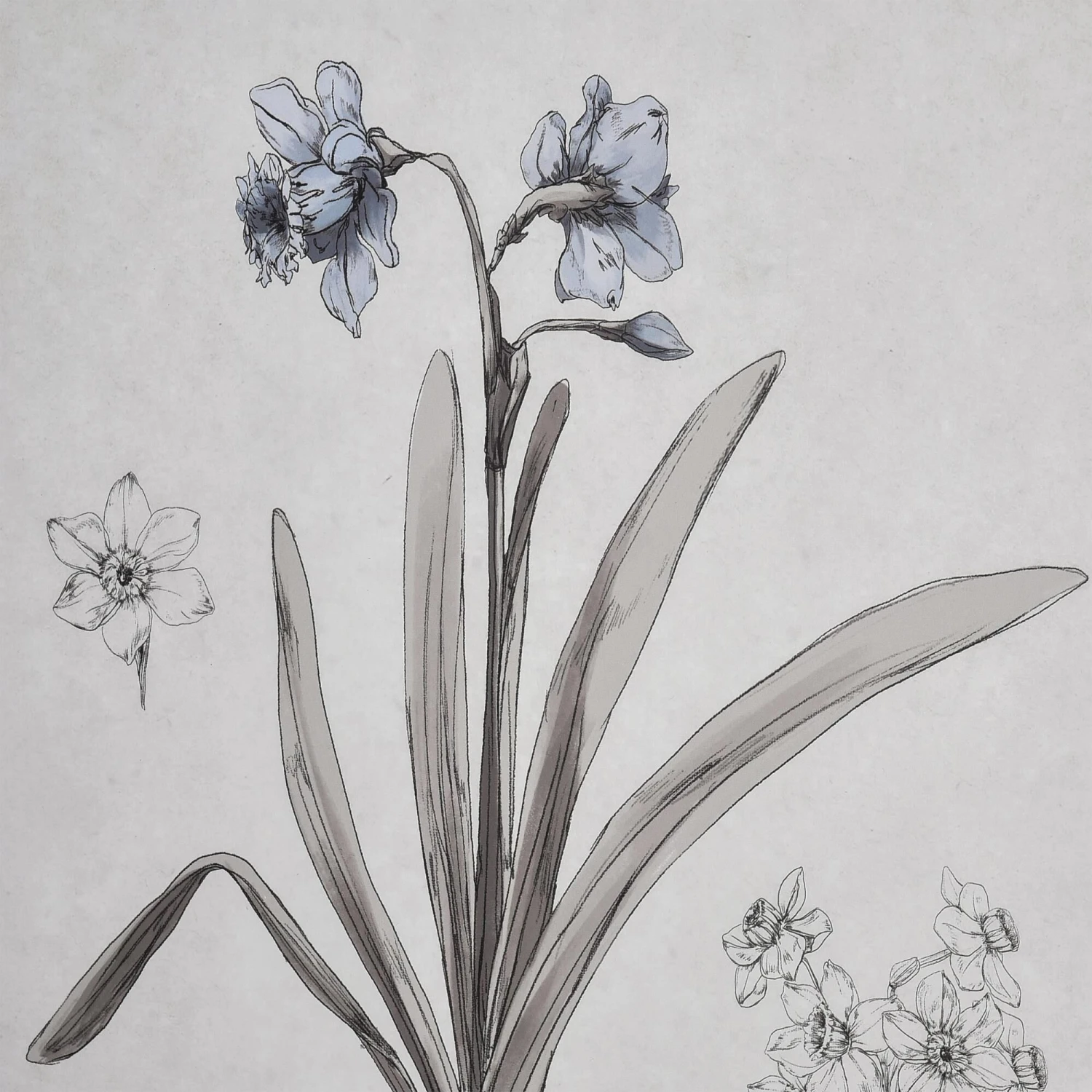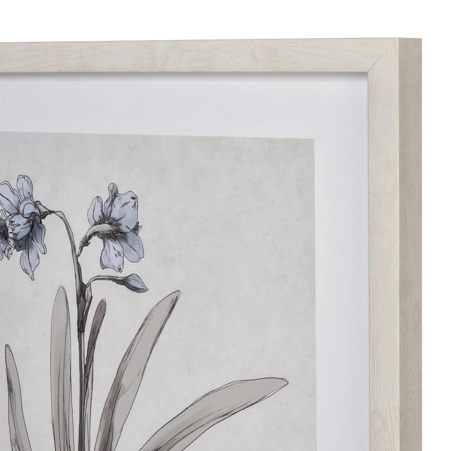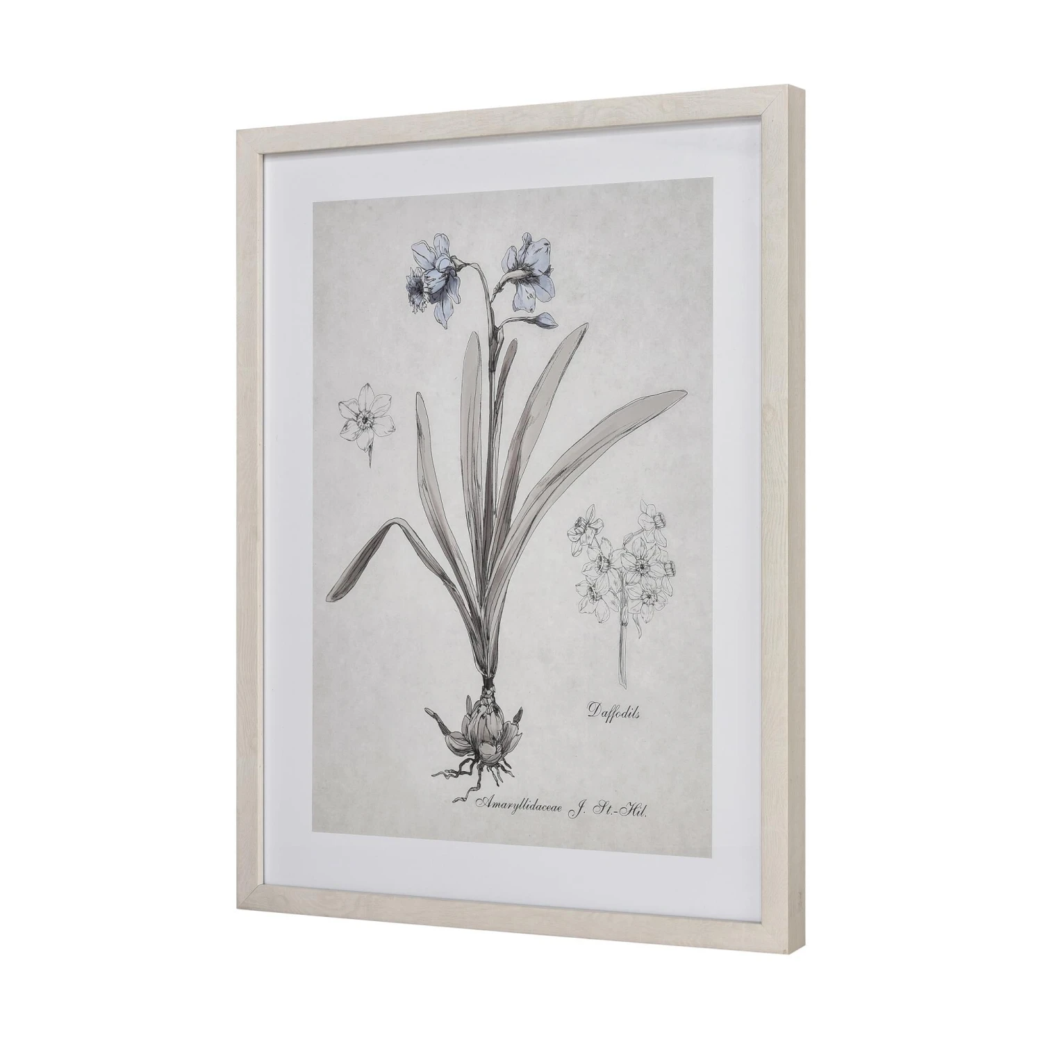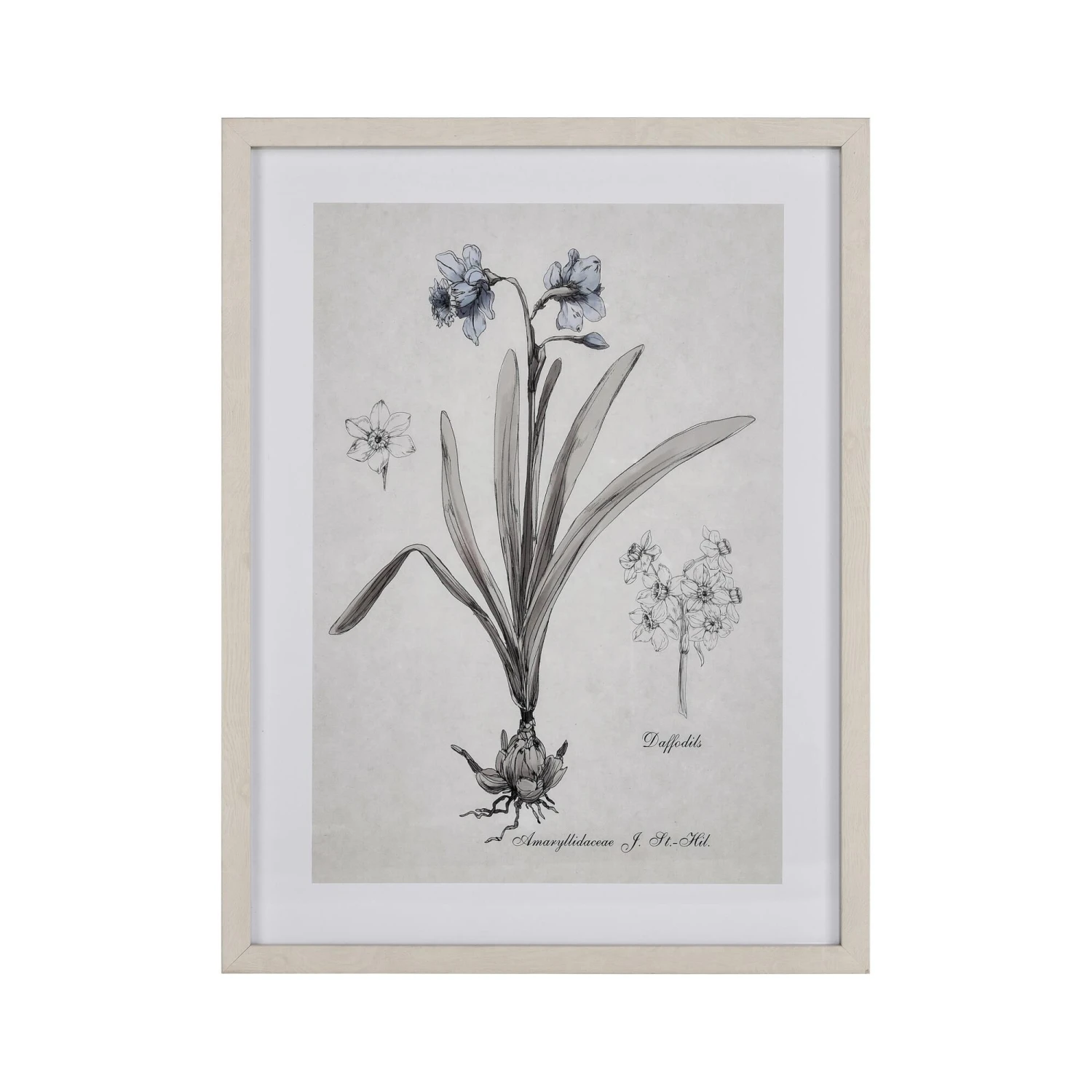 The Daffodil Botanic Framed Wall Art is a watercolor study of a blooming daffodil flower, leaves and bulb. This simple line drawing is matted in white and finished with a thin ivory frame.