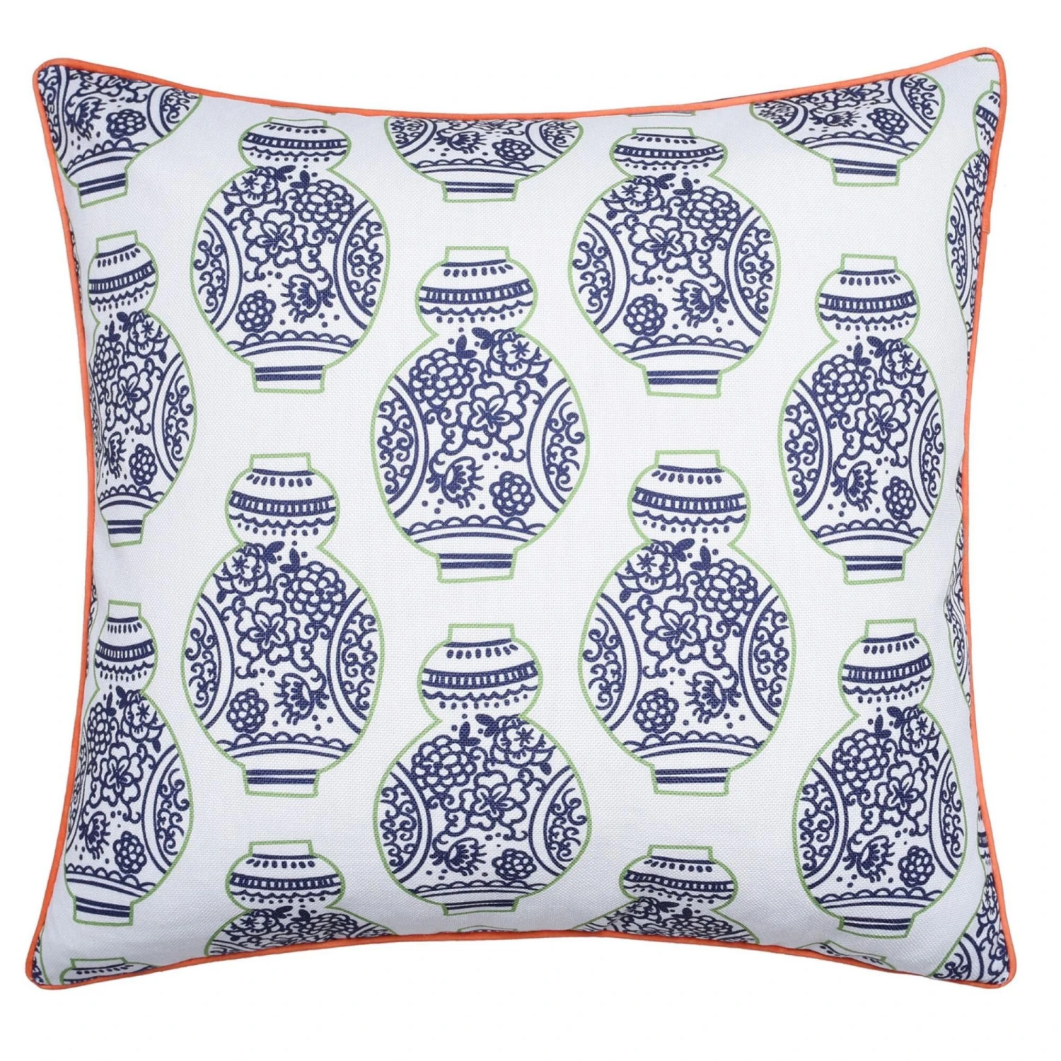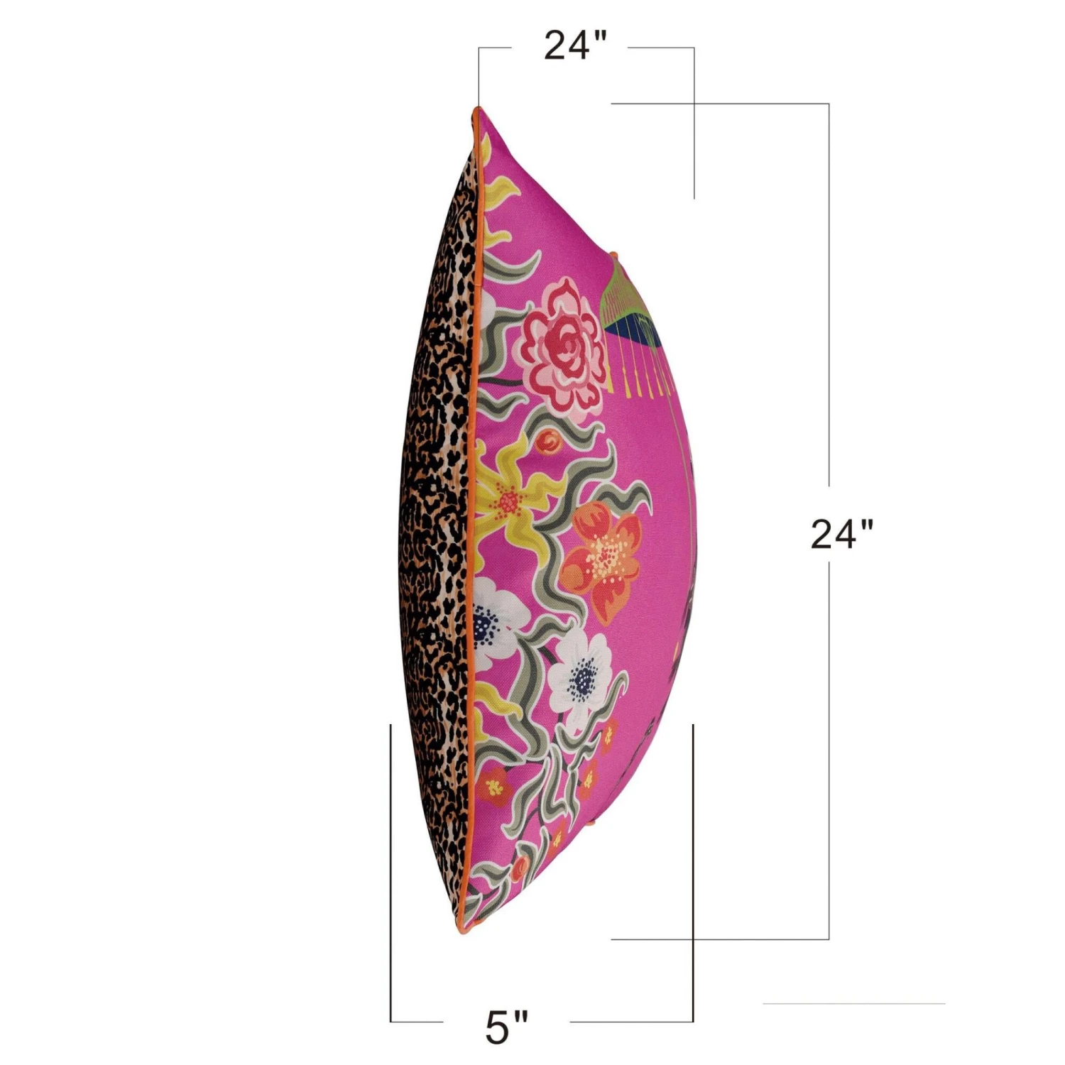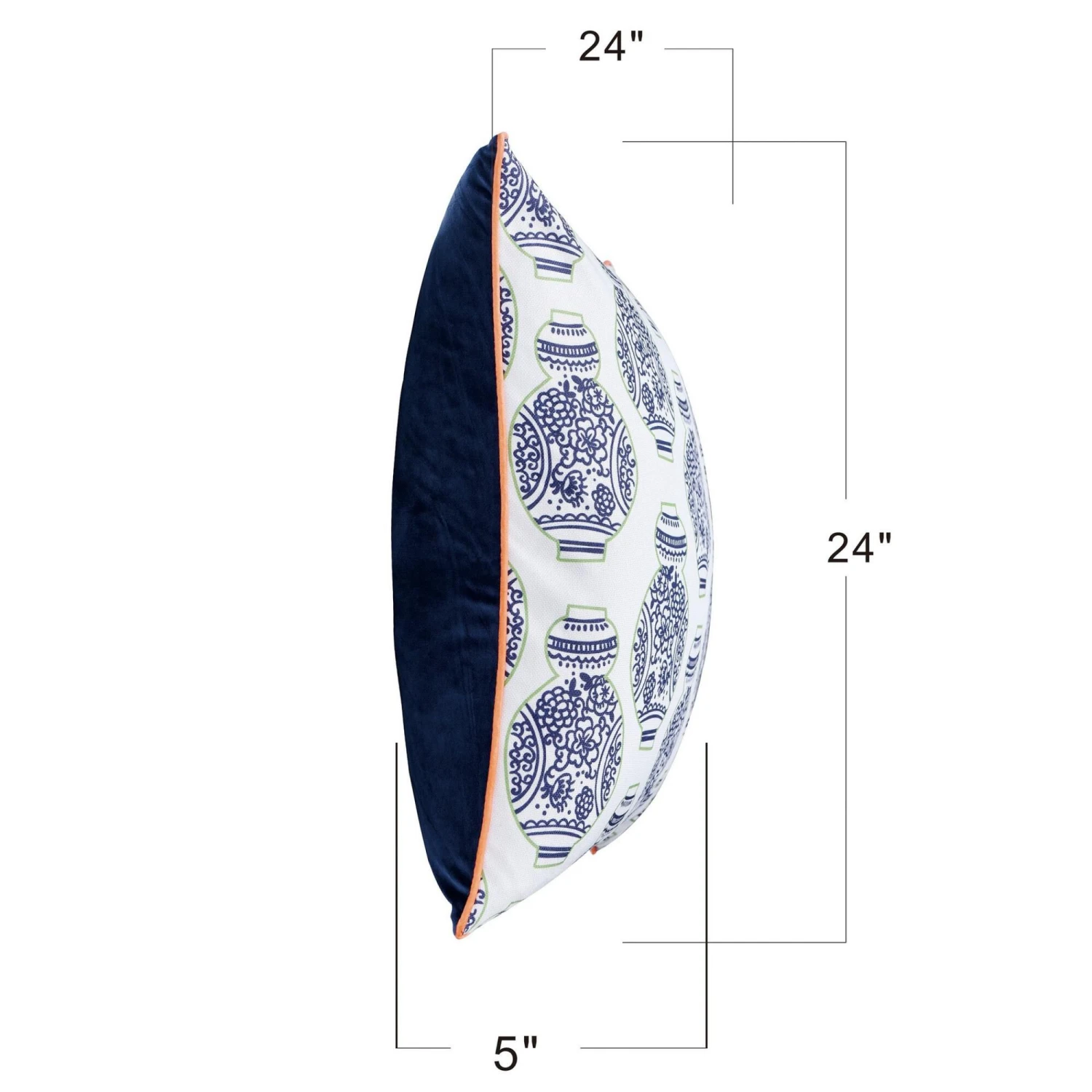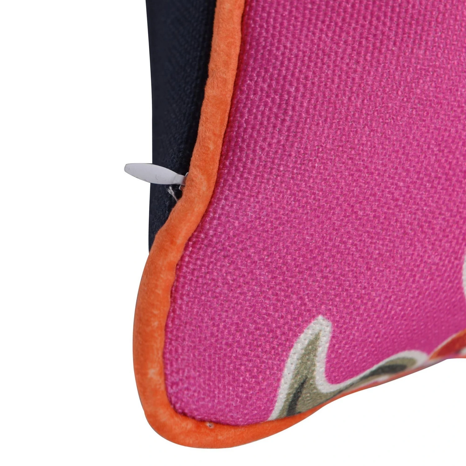 Two unique patterns with vibrant color tones alternate on each side – bringing to life a modern, eclectic, and unique home accent. Orange velvet trim detailing is added for an elevated look.