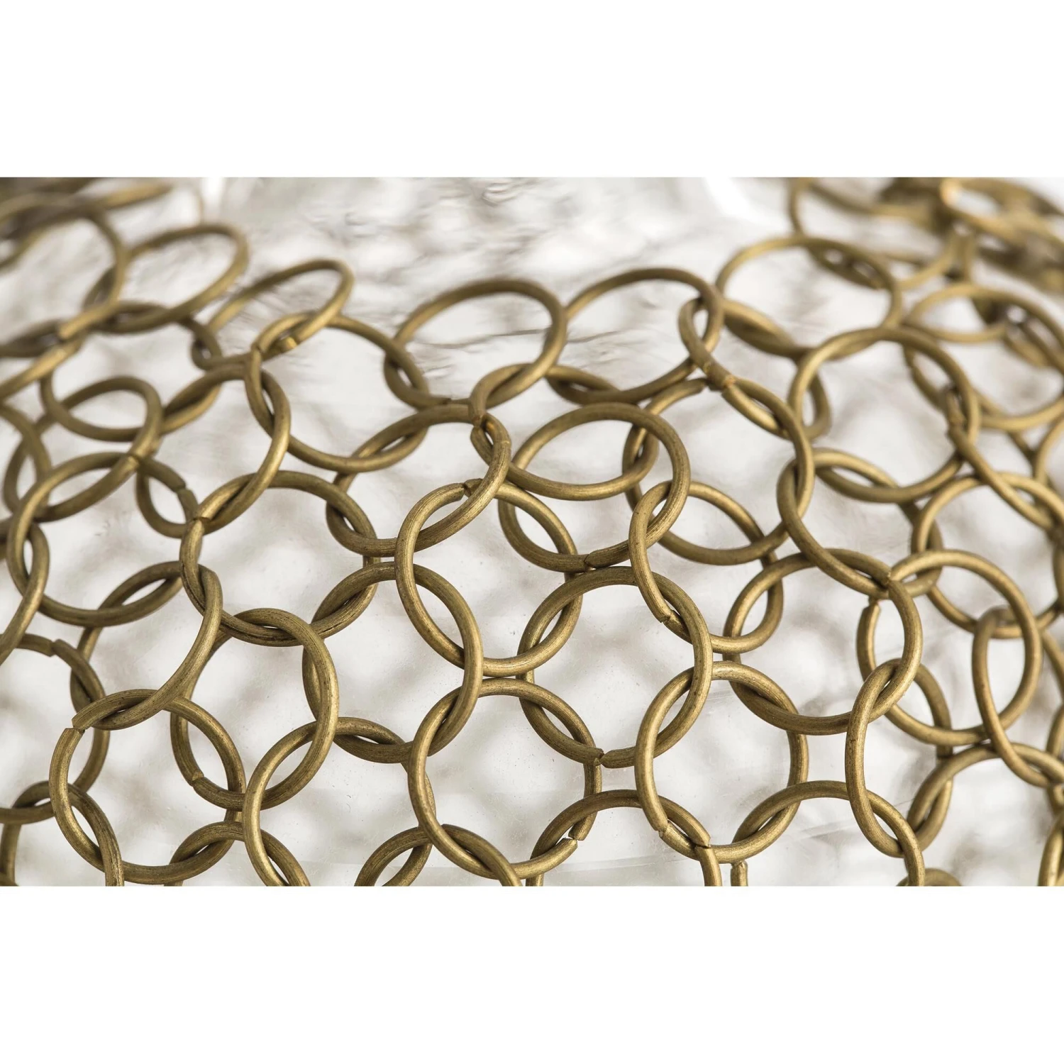 While each clear glass decanter in this exquisite set features an understated silhouette the overall design is elevated by a delicate antique brass chainmail mesh overlay. Slightly medieval the design is timeless and food safe so fill with your favorite libation and add to the collection of decanters on your bar.