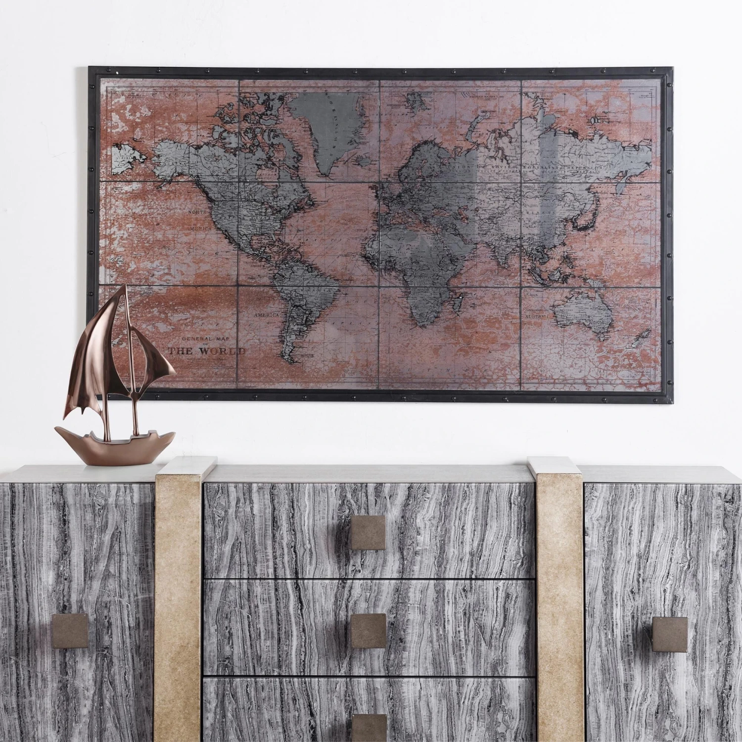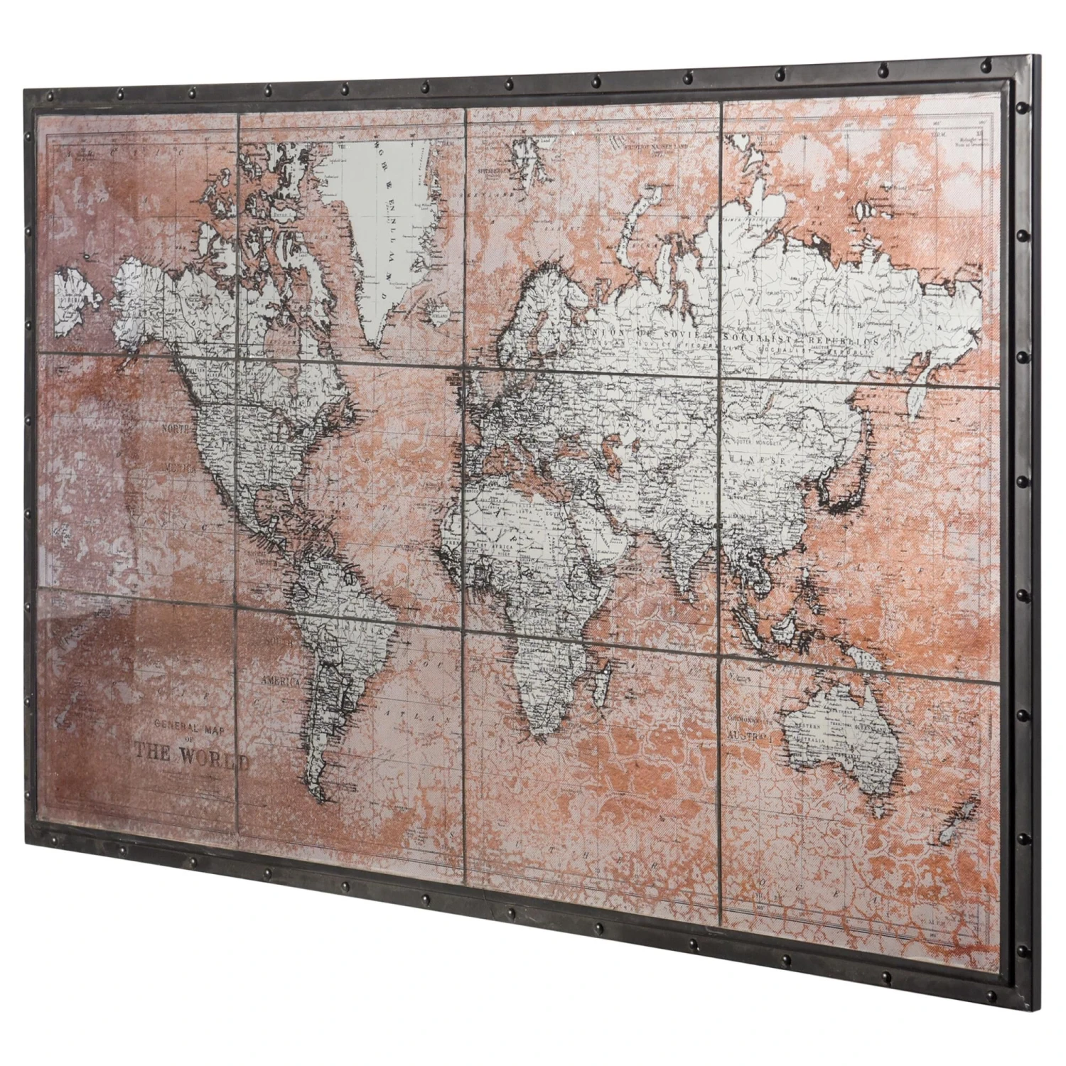 Showcase your love for topography with the Glass Rustic Atlas in Black Iron. This unique wall art piece is crafted from tiled antique glass with a printed world atlas map and emits neutral colored tones. Hang this piece in your hallway, foyer or home office.Features -Due to the production process, each piece is unique and no two are exactly alikeWall art is of tiled antique glass printed world atlas map.This wall art is framed with black iron metal.TopographyThis wall art would be a perfect addition to any wall.