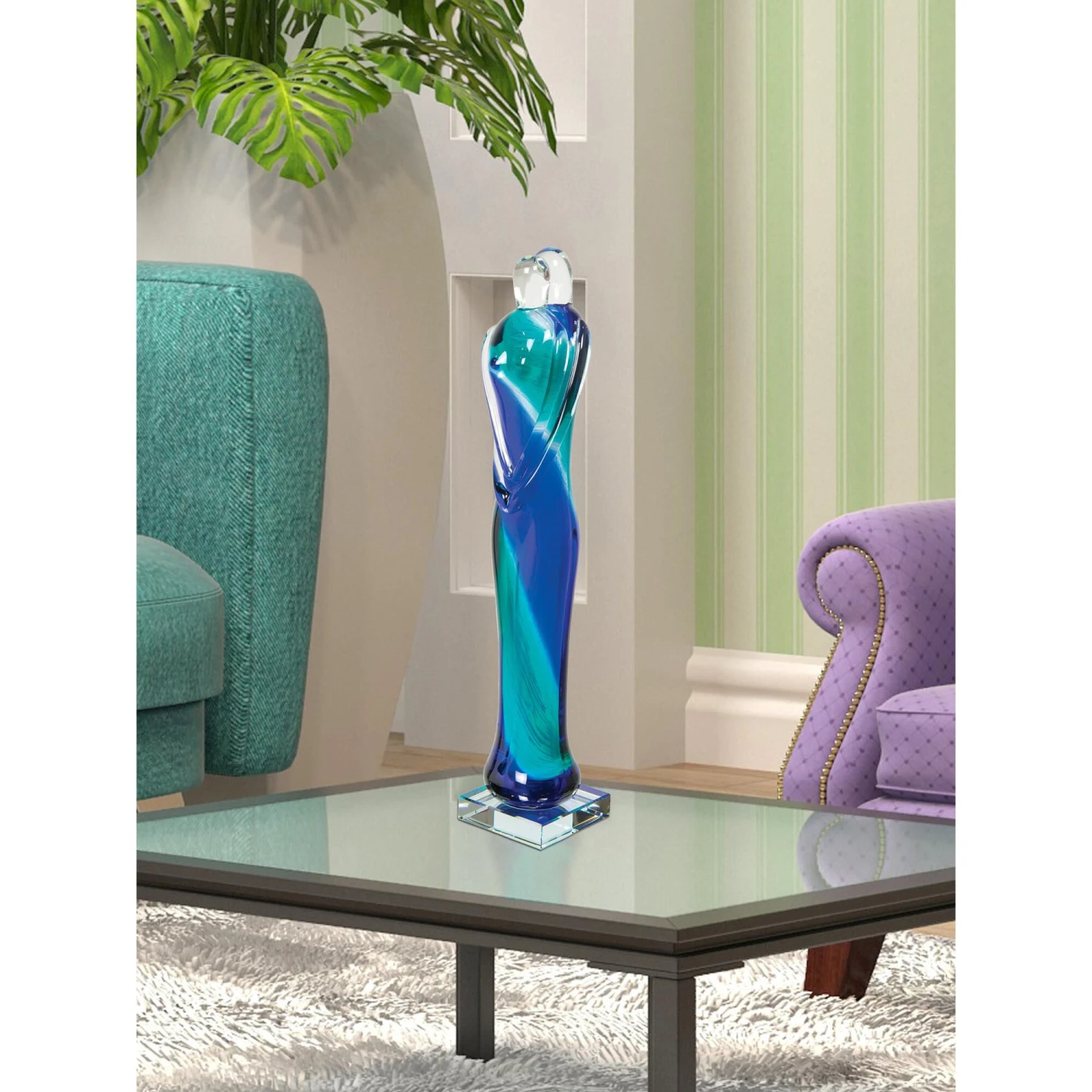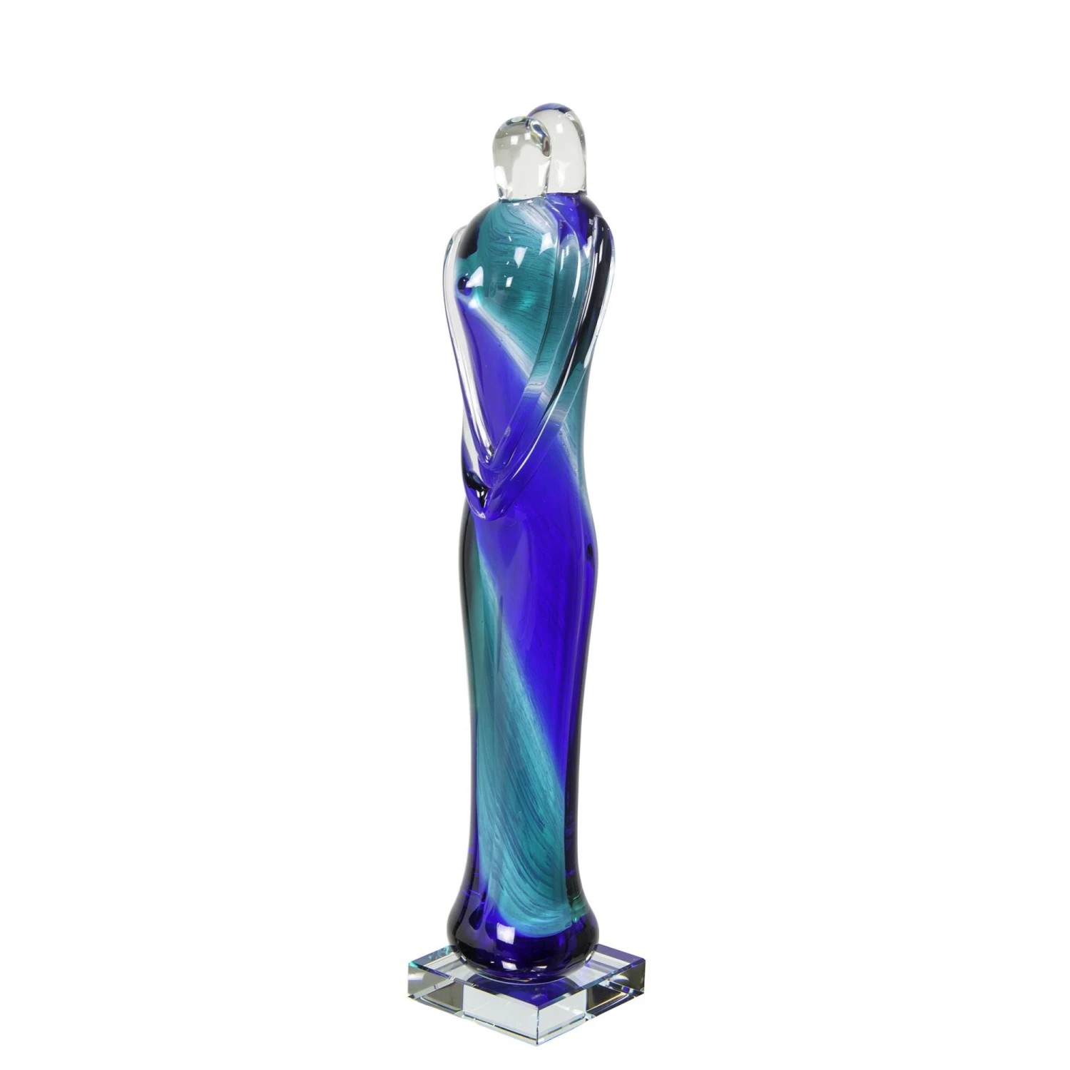 Our Eternal Embrace Handcrafted Art Glass Sculpture celebrates the special bond that can exist between a couple. The tall sculpture depicts a stylized couple in an eternal embrace. The sculpture begins with clear glass into which our artisans have hand blown a twisted blend of sea foam green and ocean blue for a lovely splash of tranquil color. The sculpture stands on a solid square pedestal of clear glass for stability and contrast. The figure is hand blown using Favrile Art Glass, which was first developed by L.C. Tiffany in the late Nineteenth Century. The Favrile process embeds the color within the glass itself, which allows for subtle variations in tone and texture. This means that no 2 pieces are exactly alike and ensures that yours is a one-of-a-kind work of art. Perfect when displayed on a curio shelf or mantle, our Eternal, Embrace Handcrafted Art Glass Sculpture makes a wonderful gift for a wedding or engagement that can also commemorate a meaningful anniversary. NOTE: Due to the nature of handmade art glass, colors, sizes and patterns may vary slightly.