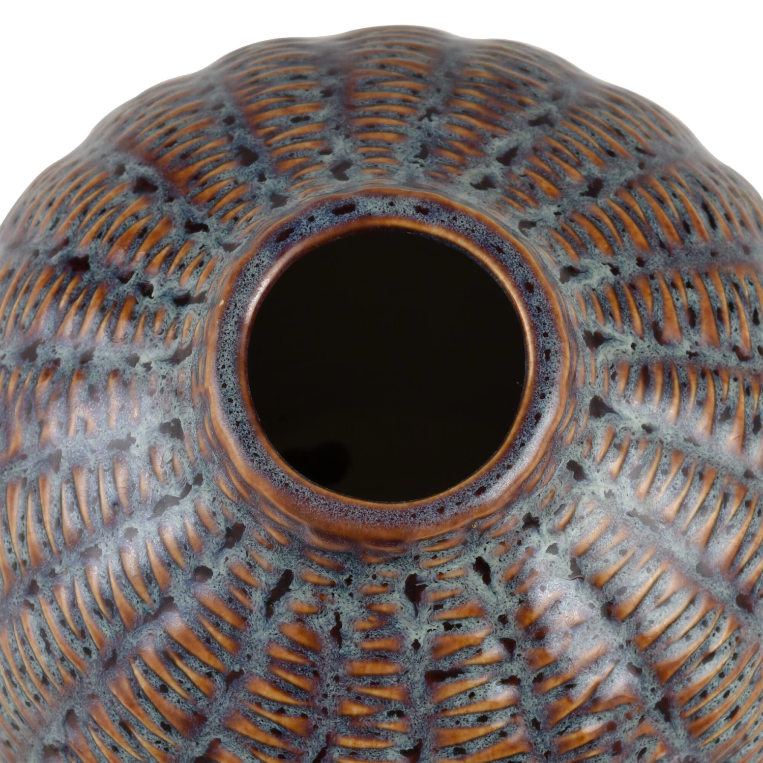 The Hawley Small Vase is a rounded, glazed earthenware vase with a rounded body and small mouth opening. A zig-zagging texture runs in lines down the surface of the vase, creating a unique reaction in the glaze which mimics the look of antiqued copper.