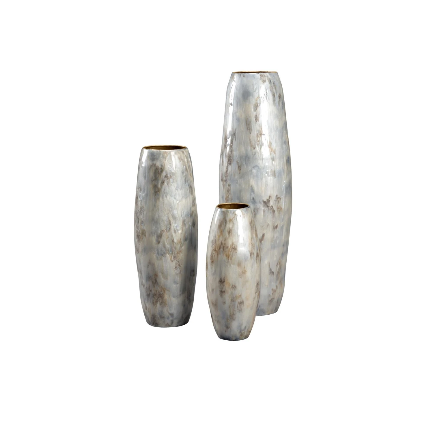 SET OF THREE DISTRESSED GRAY PAINTED ENAMEL GLASS VASES SMALL 12.5″X 5 X 5 MEDIUM 17.5″X 6 X 6 LARGE 24.5″X 7 X 7