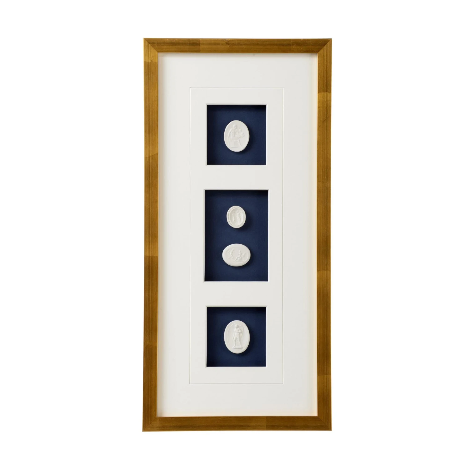 Intaglios On A Navy Background With An 8 Ply Mat With V-Groove In Gold Leaf Frame. Framed With Glass.