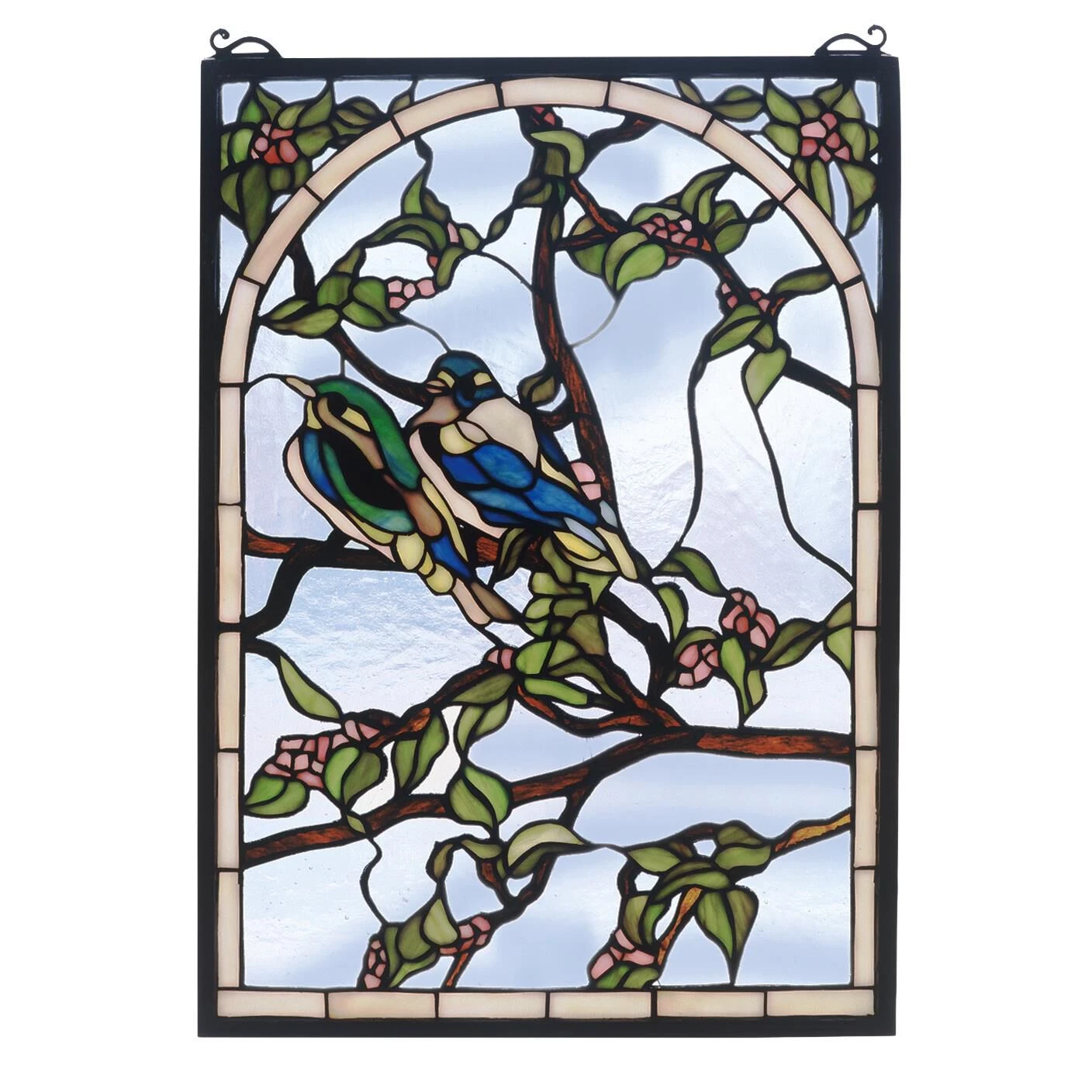 A Meyda original A pair of Teal and Sapphire lovebirds nest on branches of Bark Brown with Pink blossoms and Jade leaves. Handcrafted utilizing the copperfoil construction process and 398 pieces of stained art glass encased in a solid brass frame; each window is a unique creation to be forever treasured. Mounting bracket and jack chain included