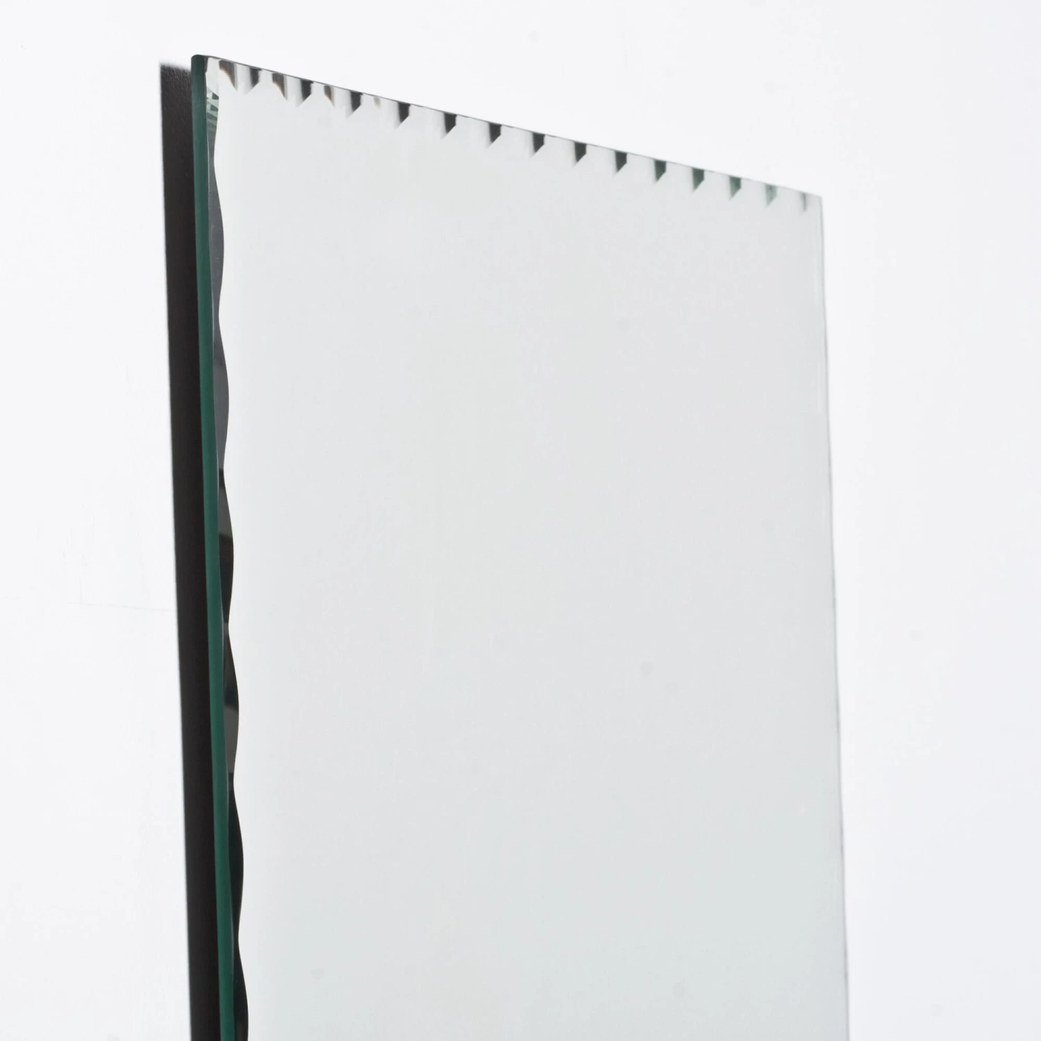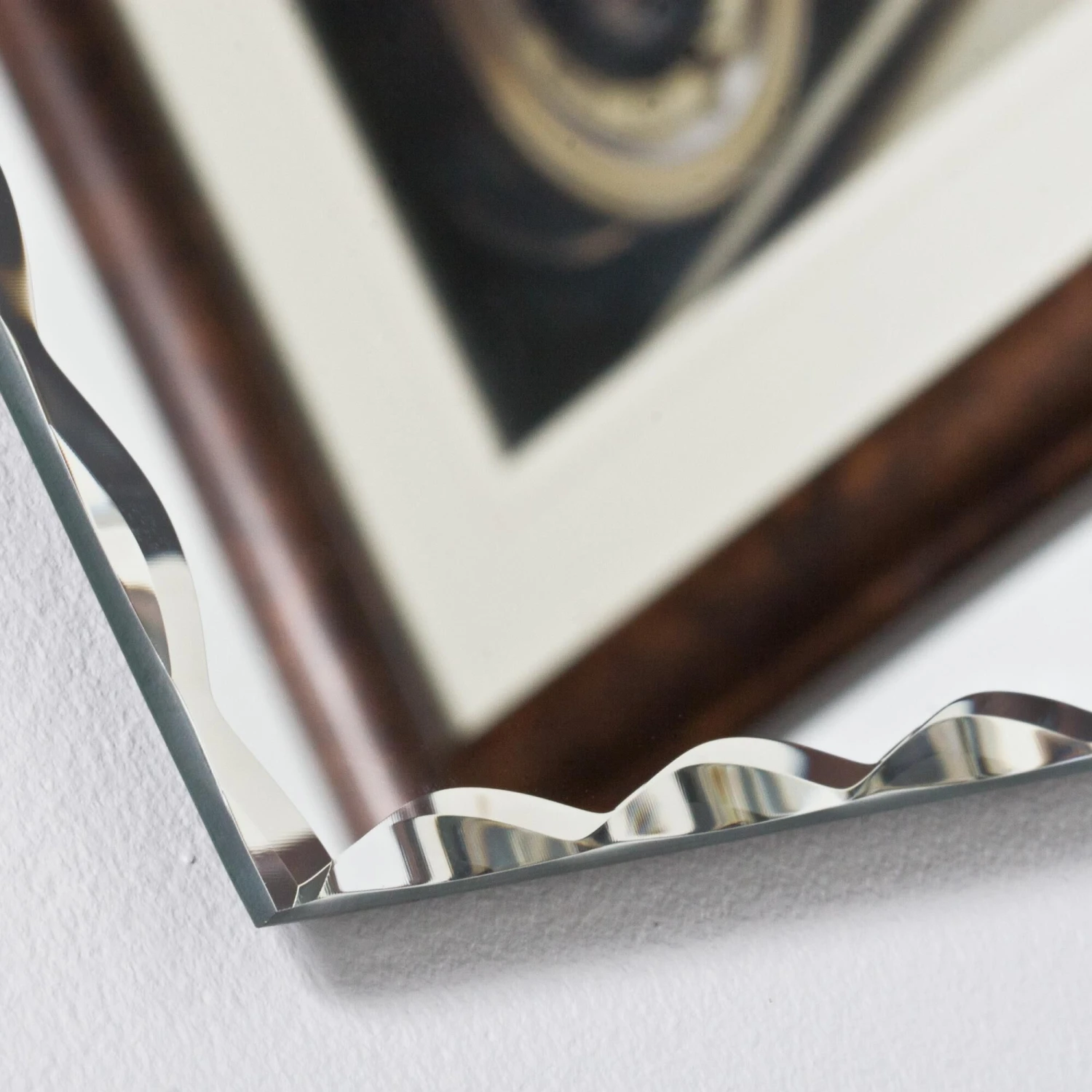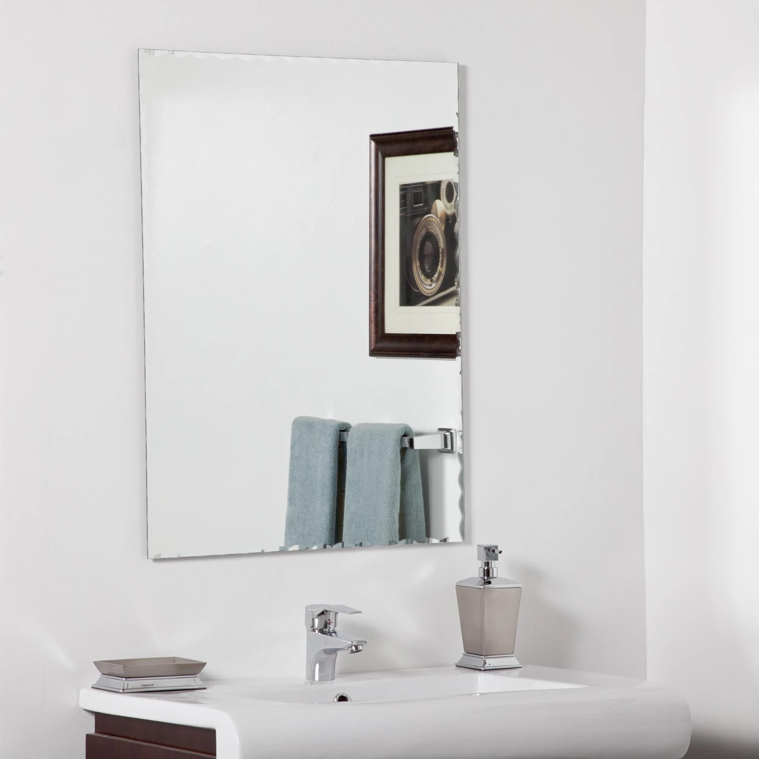 Strike a pose in front of this stylish and modern frameless wall mirror with a deep scallop bevel border. There are 3 brackets affixed to the back to hang either horizontally or vertically just chose which 2 brackets to use. This mirror features a protective coating that helps prevent tarnishing and corrosion so ideal for high-humidity areas. Alone or in multiples, this decorative wall mirror is perfect for a quick way to update your decor or a bathroom renovation. Easily mount this mirror on a variety of surfaces, including tile and drywall. Mounting brackets with screws and dry wall anchors included, hangs horizontally and vertically .