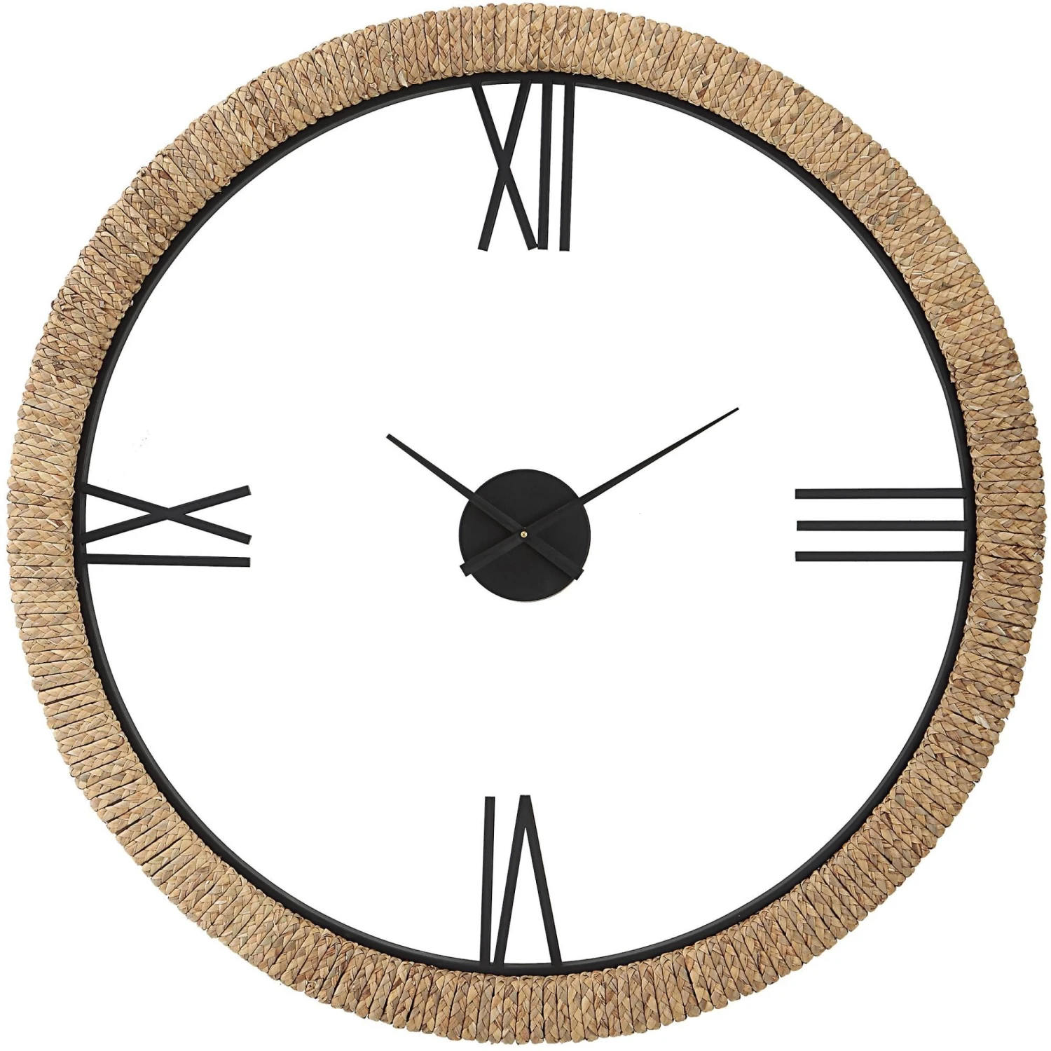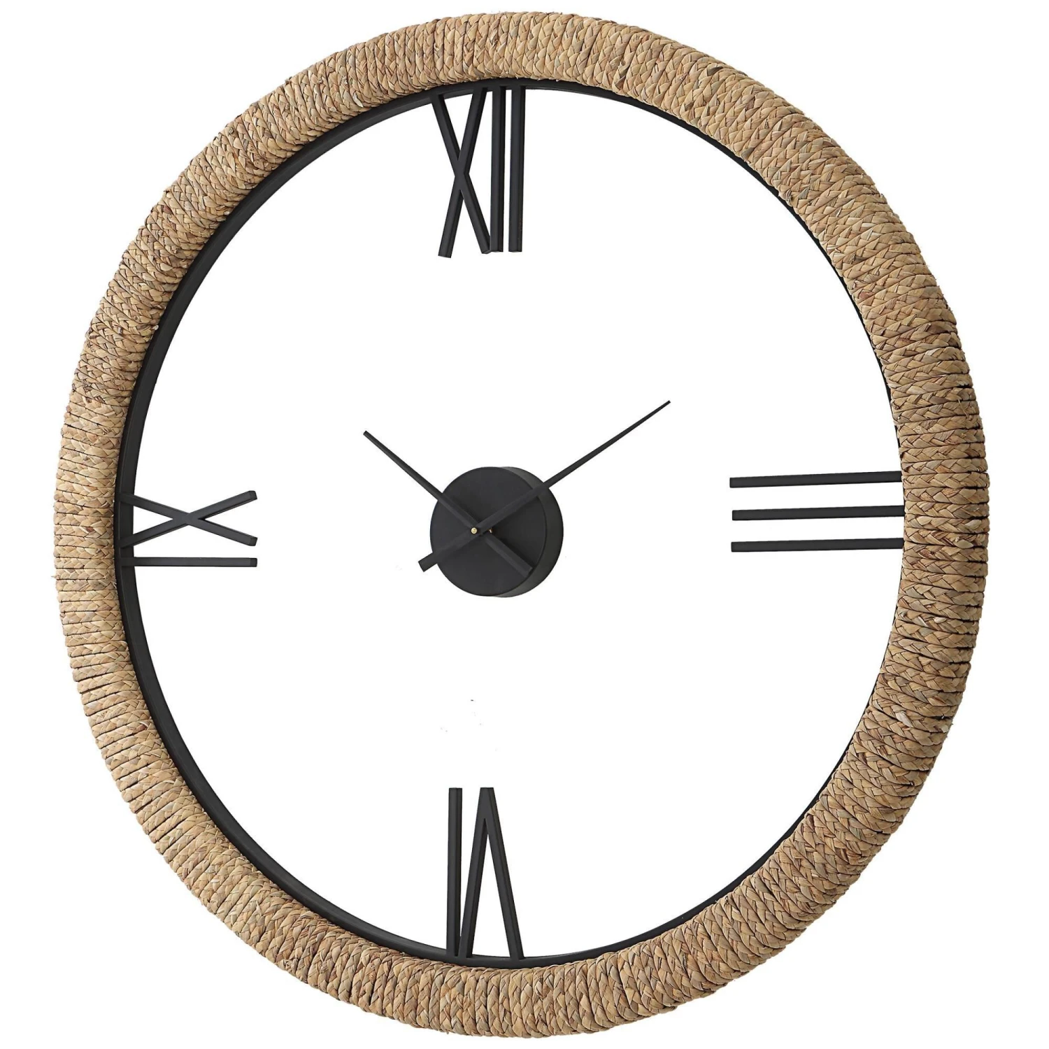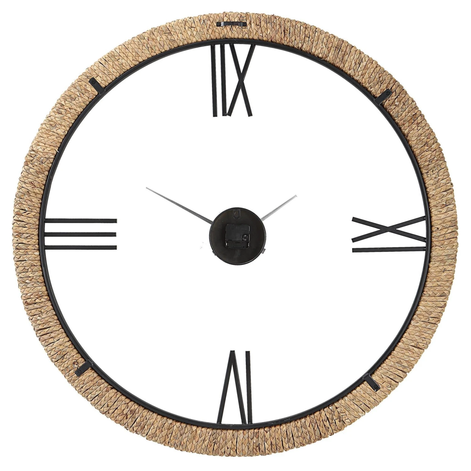 Contemporary with a touch of coastal style, this oversized wall clock features a braided banana leaf frame accented by an iron inner lip and floating center dial. Quartz movement ensures accurate timekeeping. Requires one “AA” battery.
