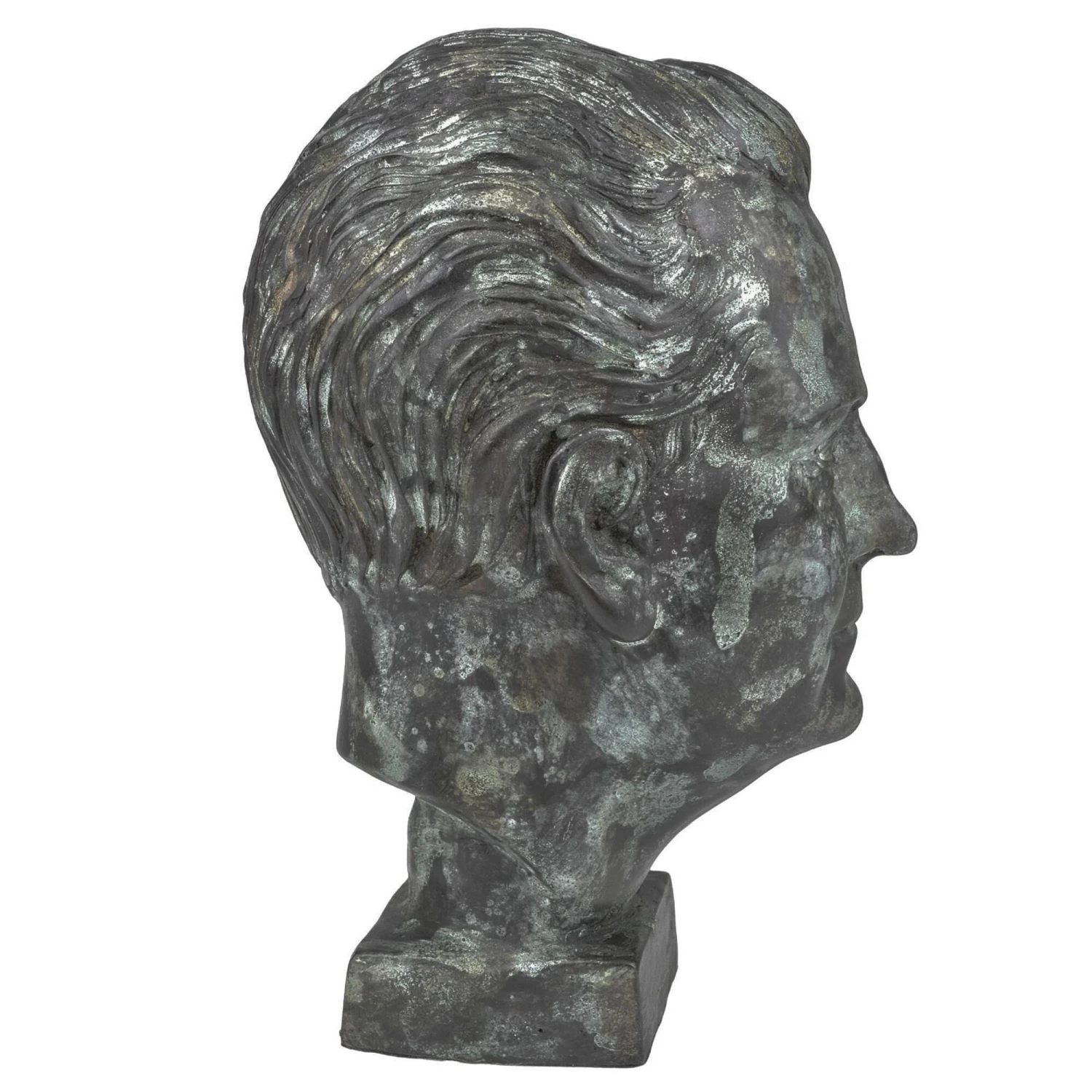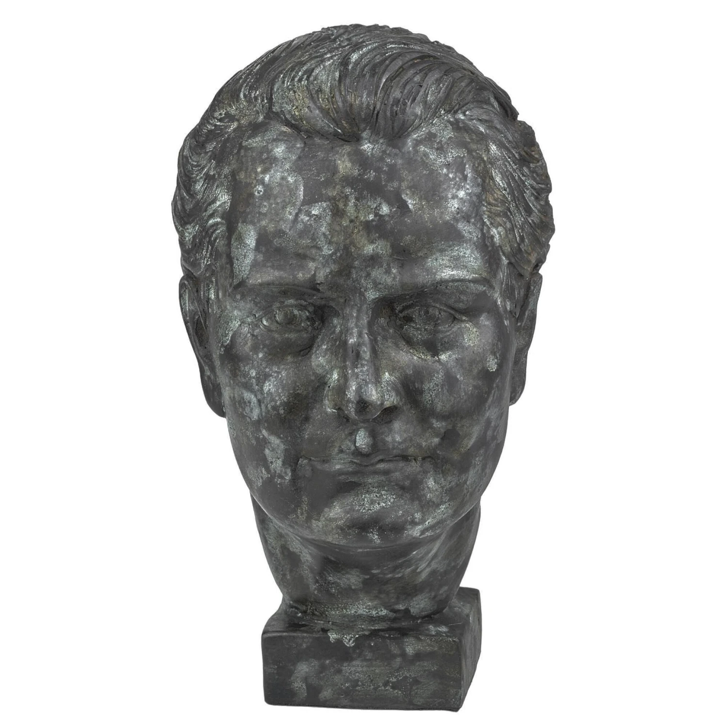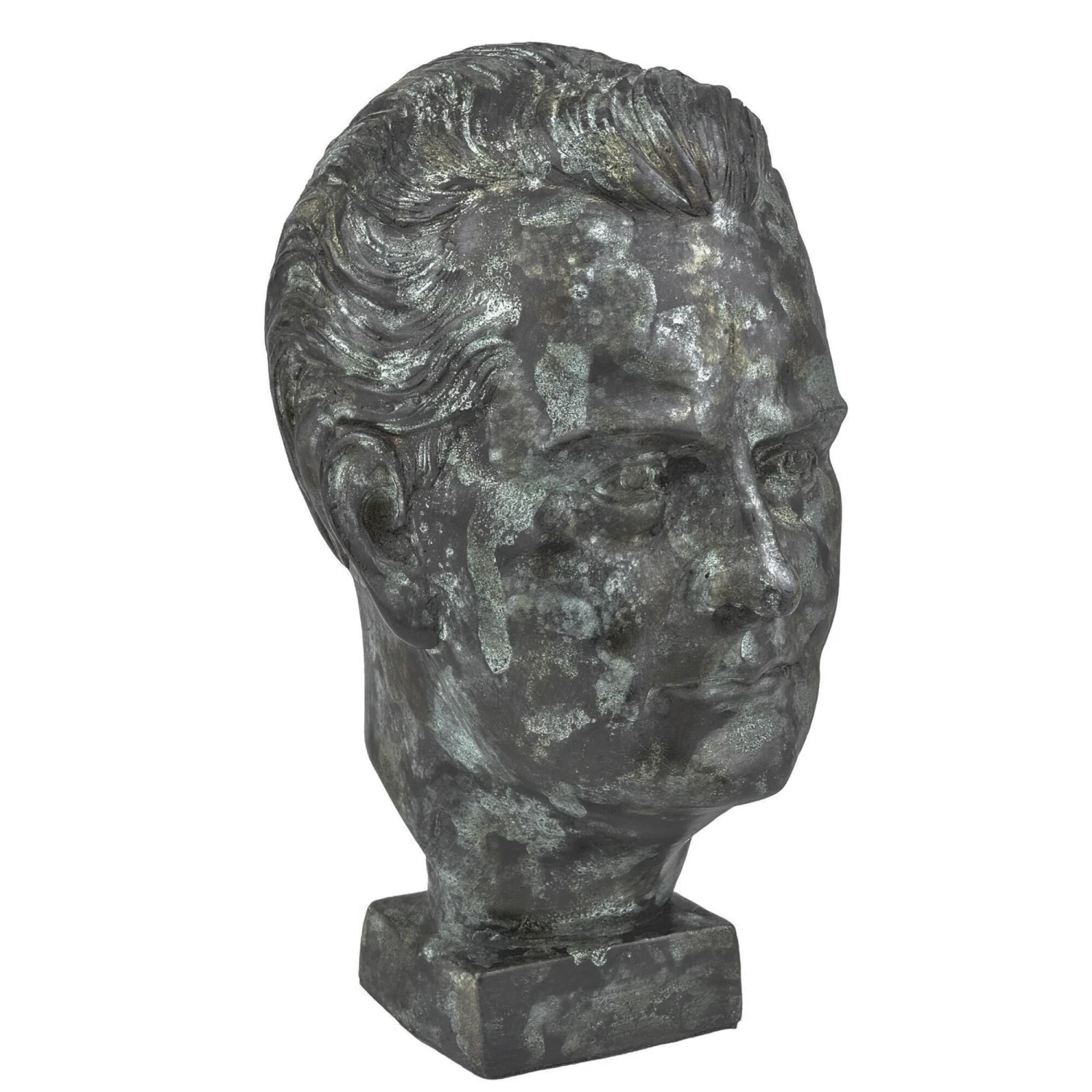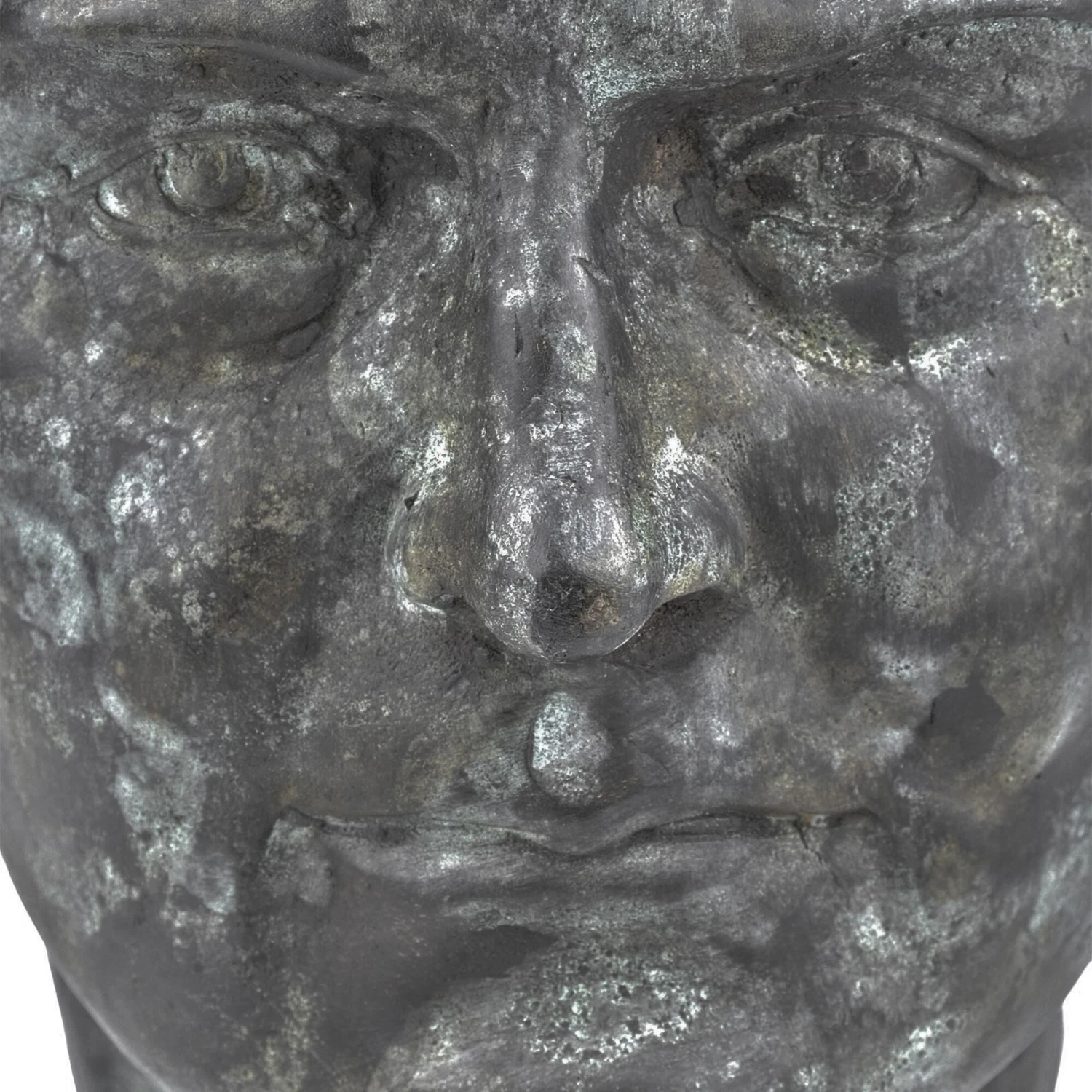 The Mysterious Man Bronze sculpture is made from a lost-wax technique when boiling bronze is poured into a mold covering an original wax sculpture that melts away. Once set, there is a very long process of refining the bronze to give it patina. This green sculpture is among our bronze art pieces that reference antique sculptures with historical significance.