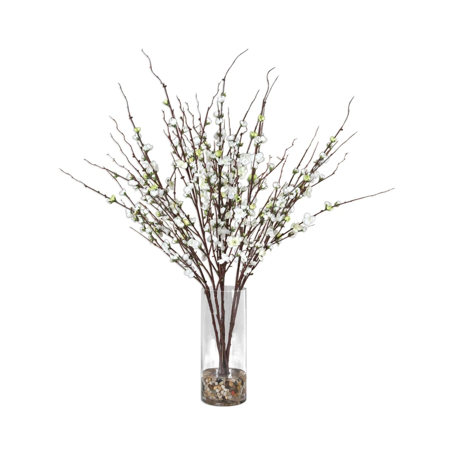 Effortlessly Arranged As If Freshly Harvested, These Quince Branches Exemplify The True Characteristics Of Live Blooms. Varying In Stages Of Openness, Cream Buds Are Accented By Natural Rocks In A Clear Glass Vase.