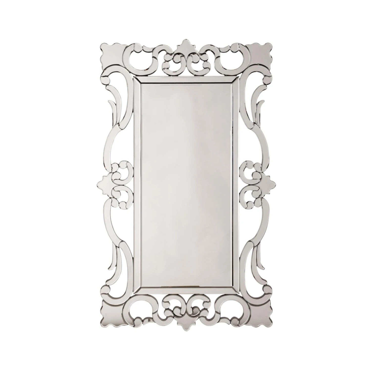 Our Rebecca mirror features an elegantly ornate open-work frame. The frame itself is fashioned from scrolling mirrored sections. It is a perfect focal point for an entryway, bathroom, bedroom or any room in your home. D-rings are affixed to the back of the mirror so it is ready to hang right out of the box either vertically or horizontally! The each mirrored section on this piece has a bevel adding to its beauty and style.
