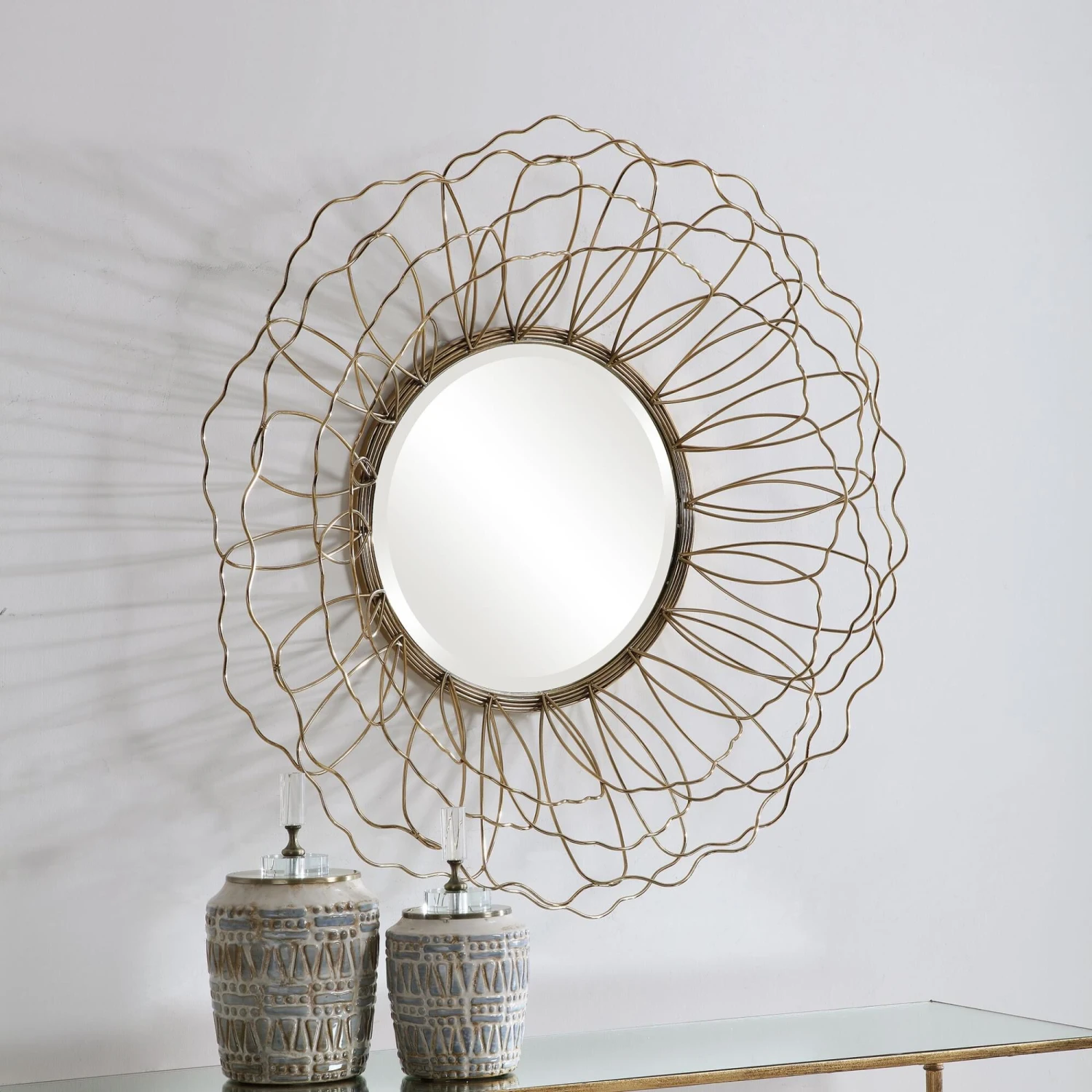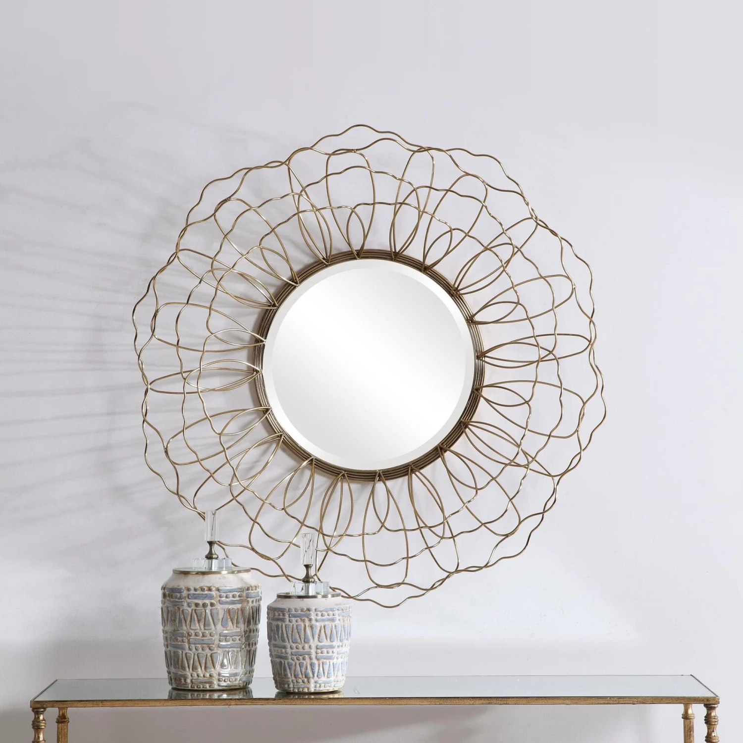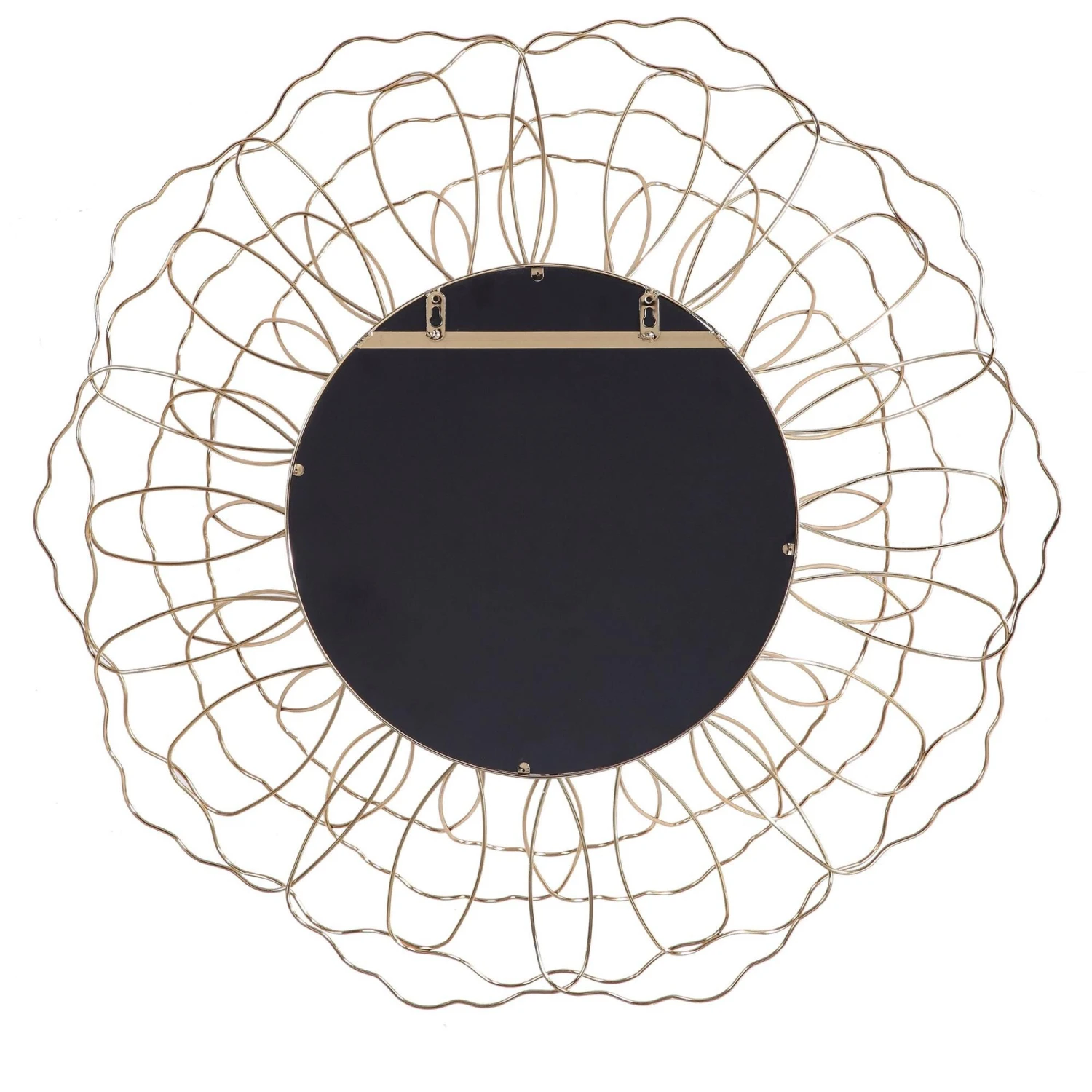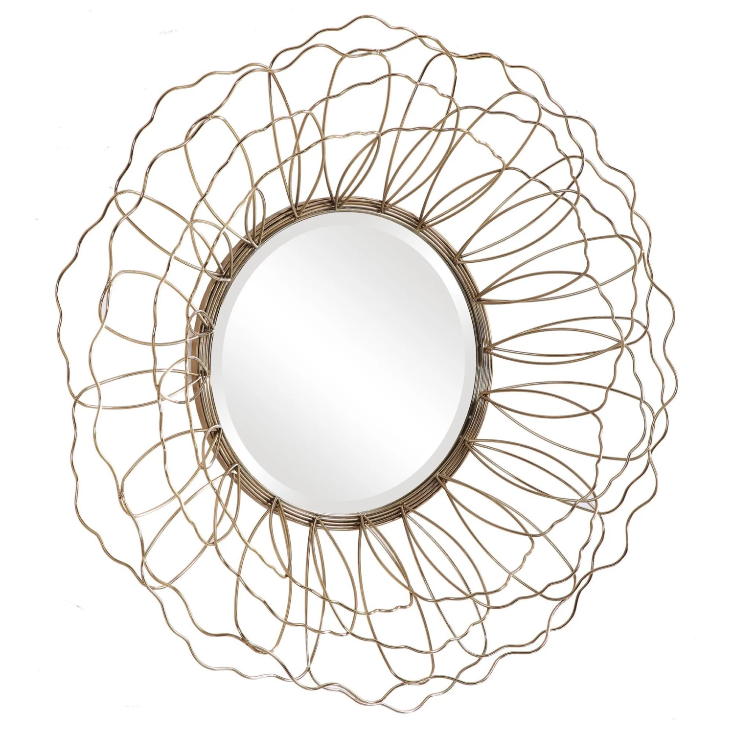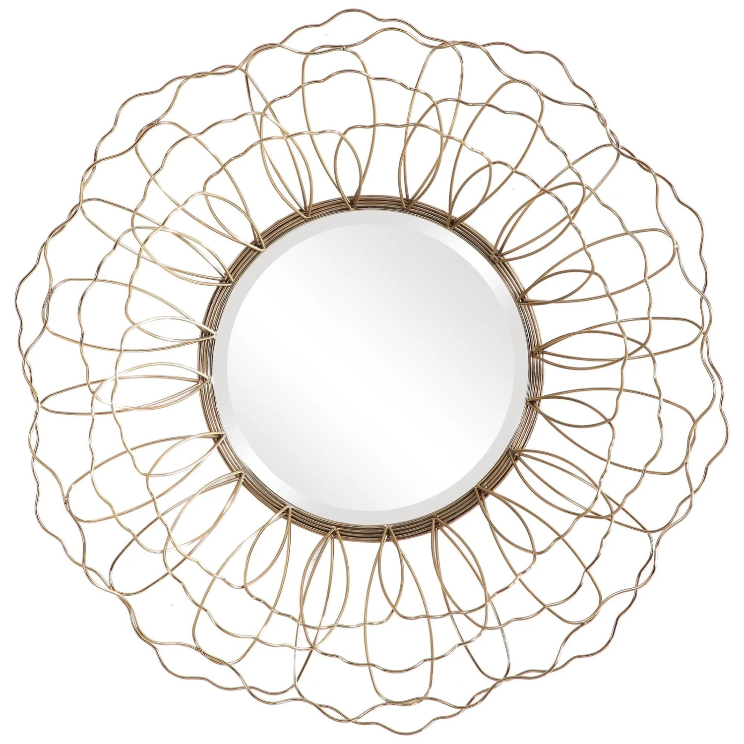 This Round Mirror Features A Solid Steel Frame With A 3-dimensional Floral Motif Finished In Antique Gold With A 1″ Bevel.