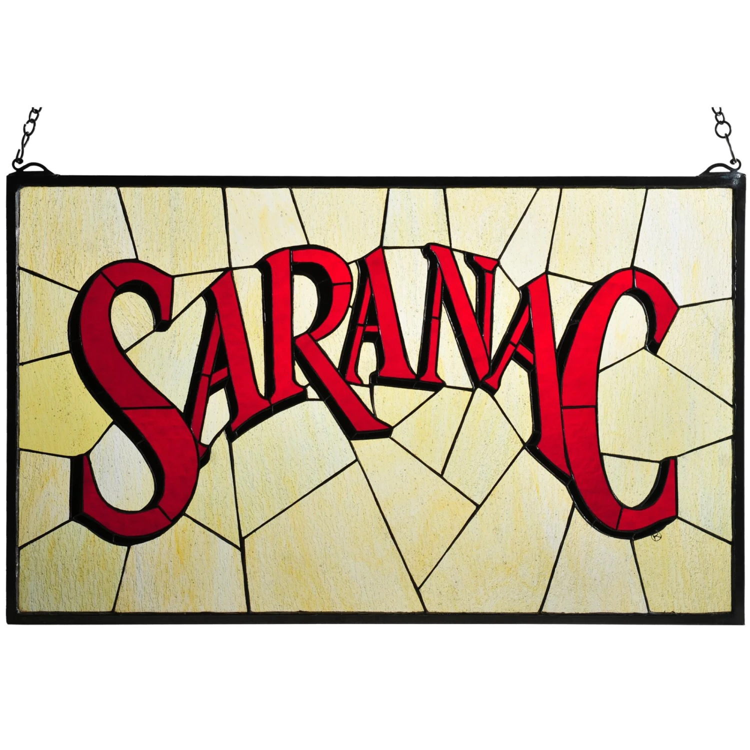A custom crafted window featuring the popular Saranac logo of the popular craft beer brand that is brewed in Utica; New York. The Red Saranac logo is featured on a Wispy Golden Ale colored background with a gentle texture of shallow river rapids. The window was created using Meyda Tiffany’s famous copperfoil construction process. The frame is finished in Black and hanging chains are included. Meyda offers complete custom capabilities to create stained glass windows or lighting featuring any design; company name or logo.