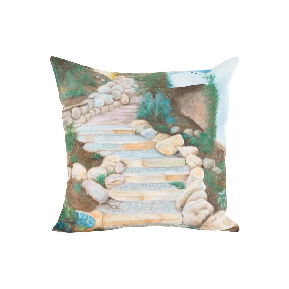 Hand-painted landscape on white acrylic fabric pillow.