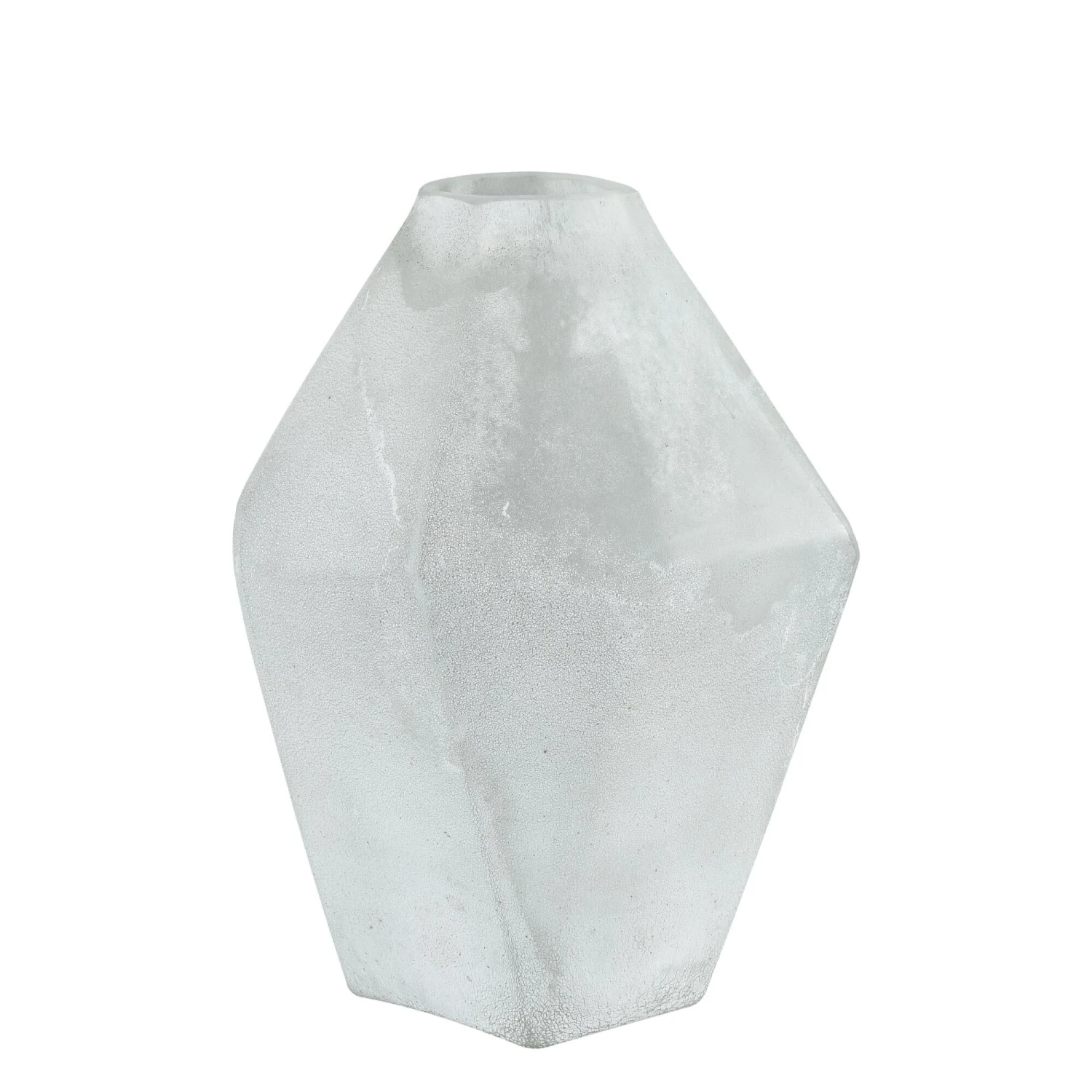 The Studio Vase is a faceted, angular earthenware vase with a textured matte white finish. With an elongated stylized shape, this vase makes a modern, sculptural statement on a table or display area.