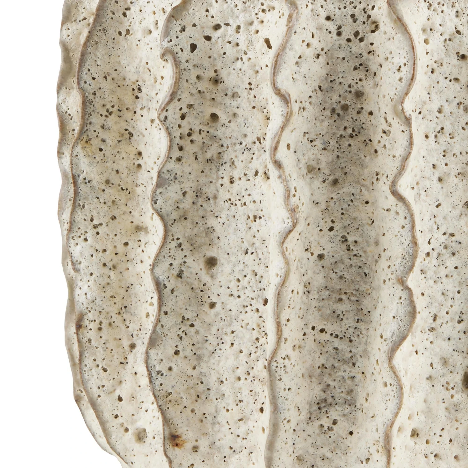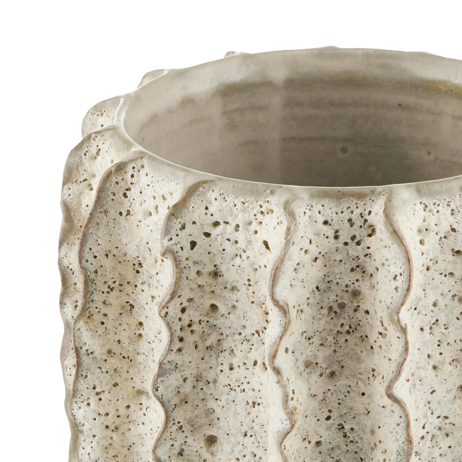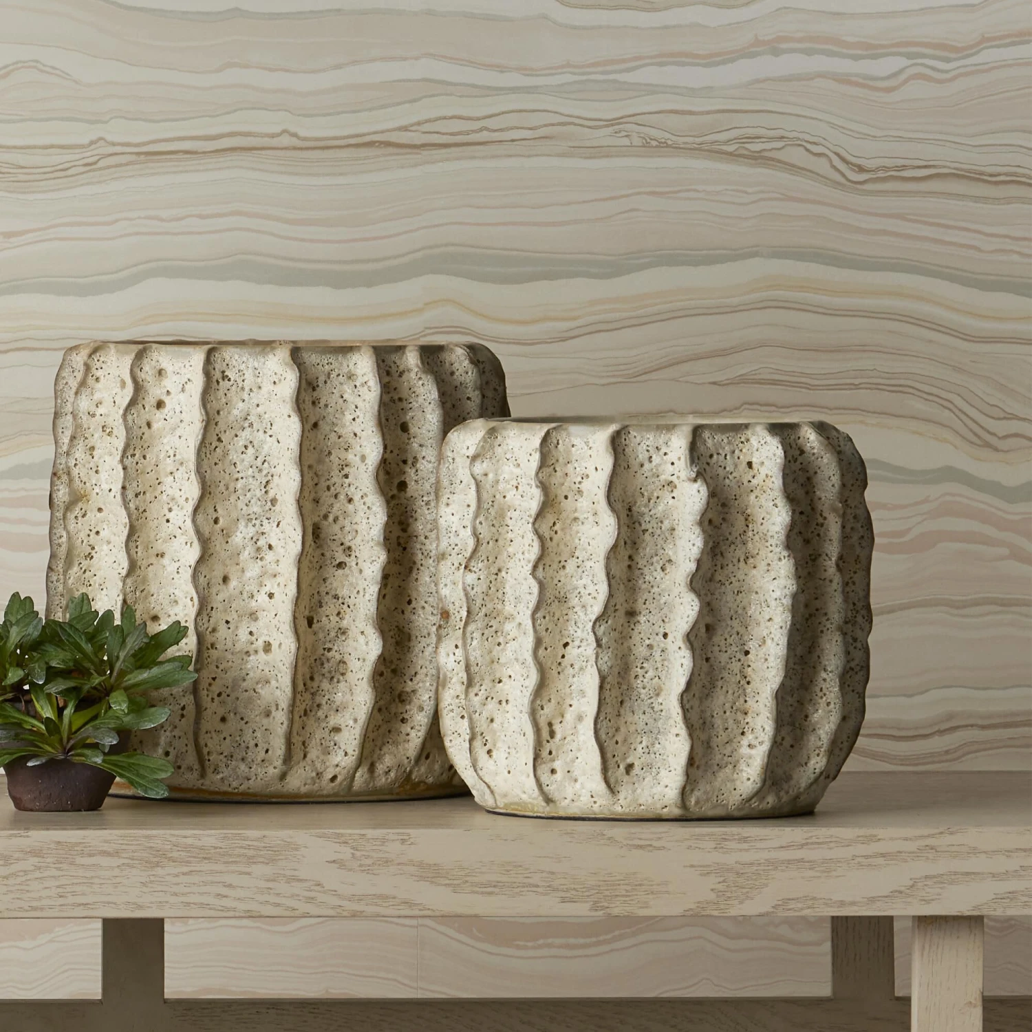 The Sunken Boat Moss White Small Cachepot is made by a group of women who live at the border of Burma and Thailand. The black terracotta has a moss white glazing covering it and pits in the glazing, the result making the ivory planter feel as if it has been reclaimed from a sunken boat after having spent years in the deep sea. All ruffles on these vessels are done by hand in the pinch method, which is a painstaking process.