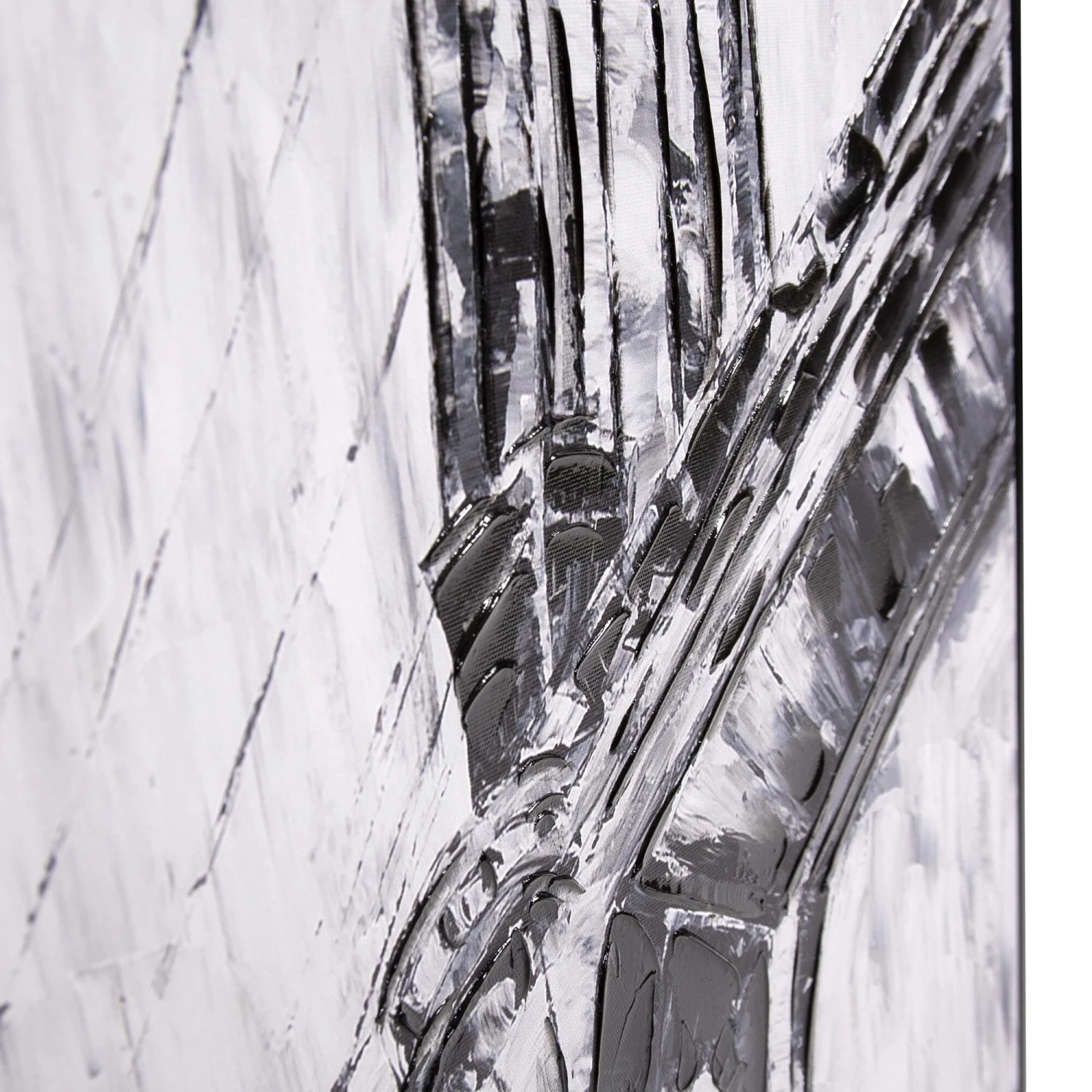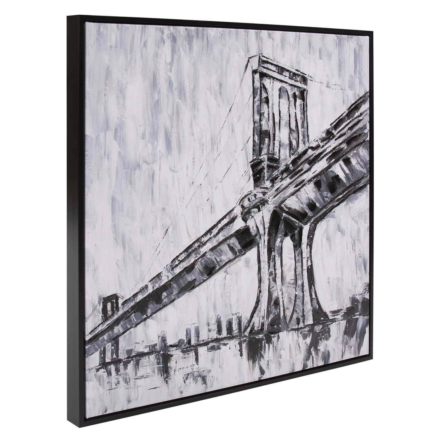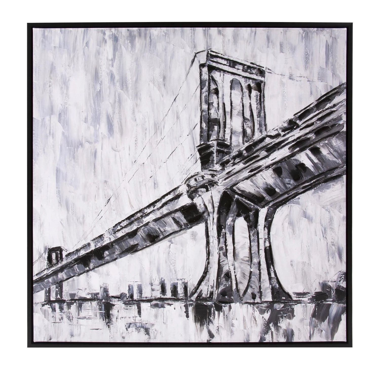 Architecture has long been a source of artistic expression and inspiration. Here the iconic Triborough Bridge in New York City is captured in this black and white print with giclee brush strokes that add depth and dimension. The canvas is set into a black faux wood floating frame. D-rings are affixed to the back of the frame so it is ready to hang right out of the box.