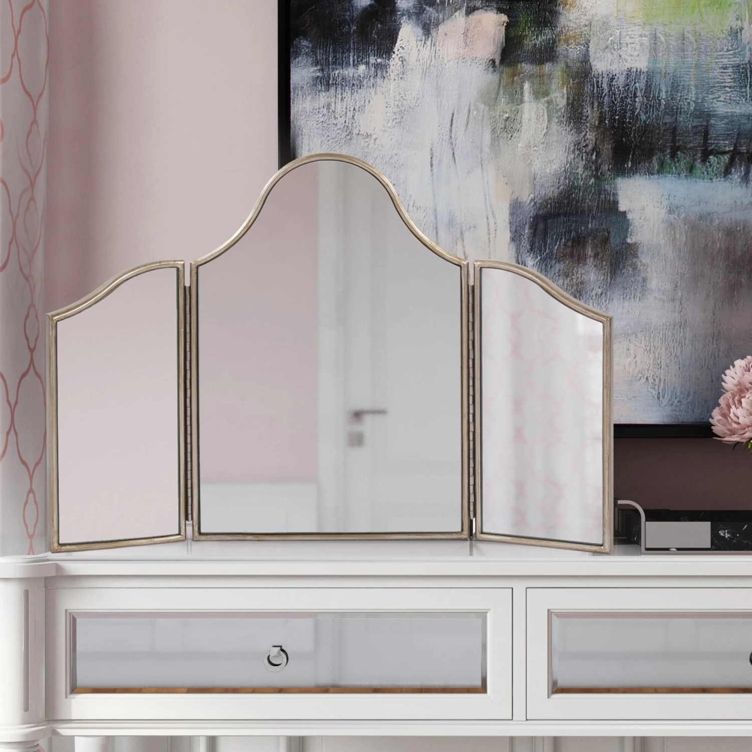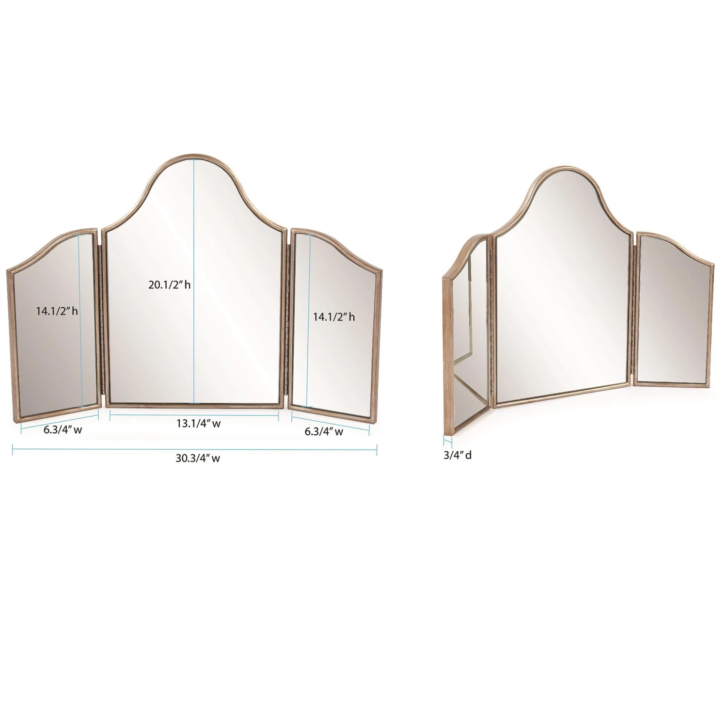The Vivian mirror invokes the feel of old Hollywood in it’s full glamour. The gracefully arched top and the glowing champagne finish helps set a stage for any occasion day or evening.
